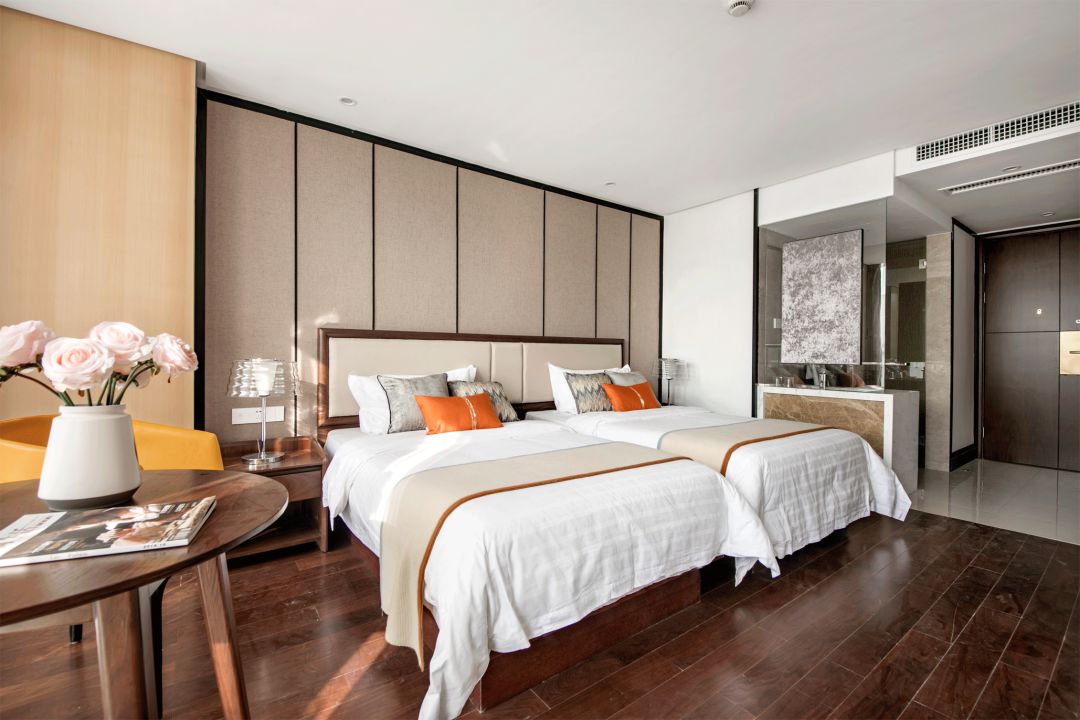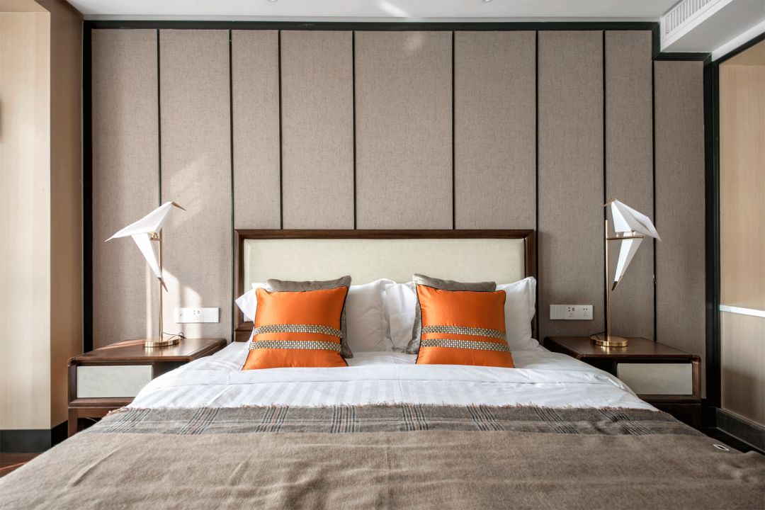 套房:温暖的沙色,带来了视觉上的舒适享受,如同沙般顺滑,爱马仕橙的靠包是空间里的对比颜色,一个柔和,一个热情,诠释着整个空间的高雅时尚。