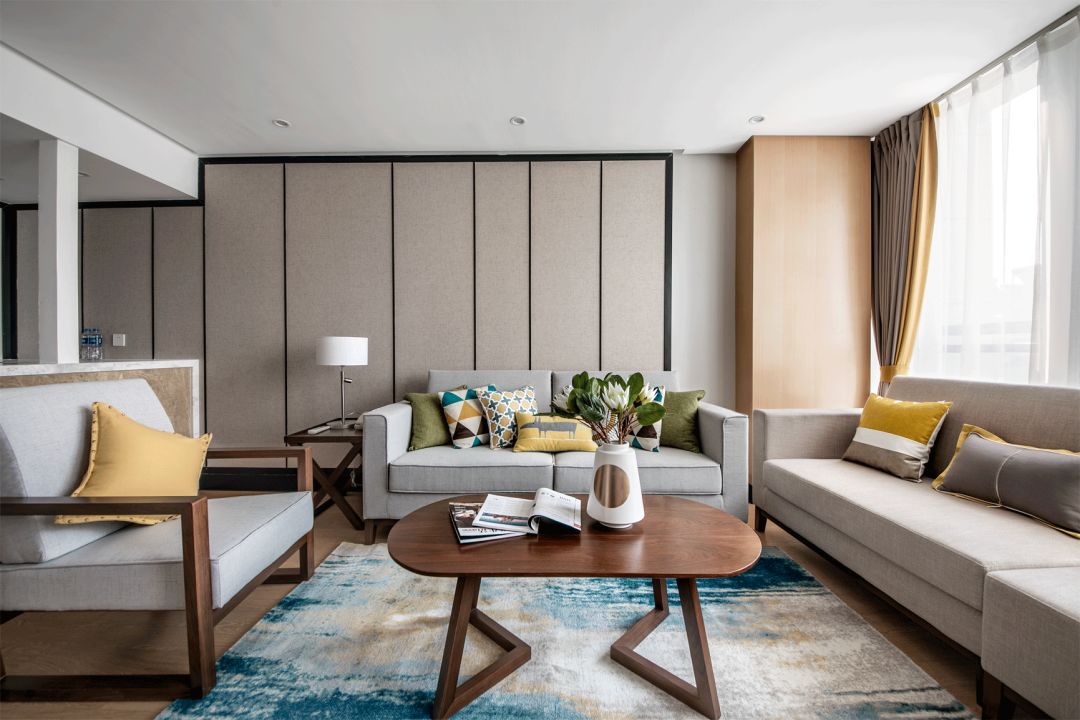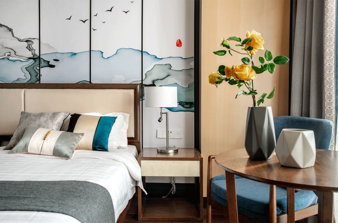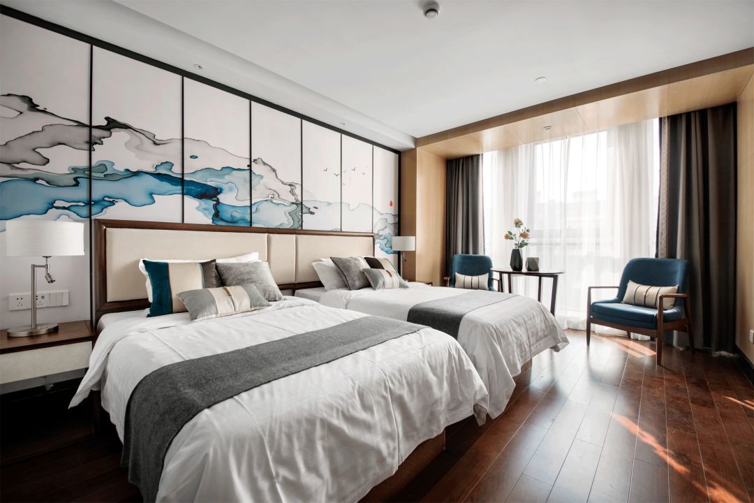 标间:浅咖的暖色,灰蓝的冷调,在空间中谱写着和谐的旋律。粗麻编织的床品、精致光滑的灯具、手工锻造的金银饰盘,呈现生活的别样质感。