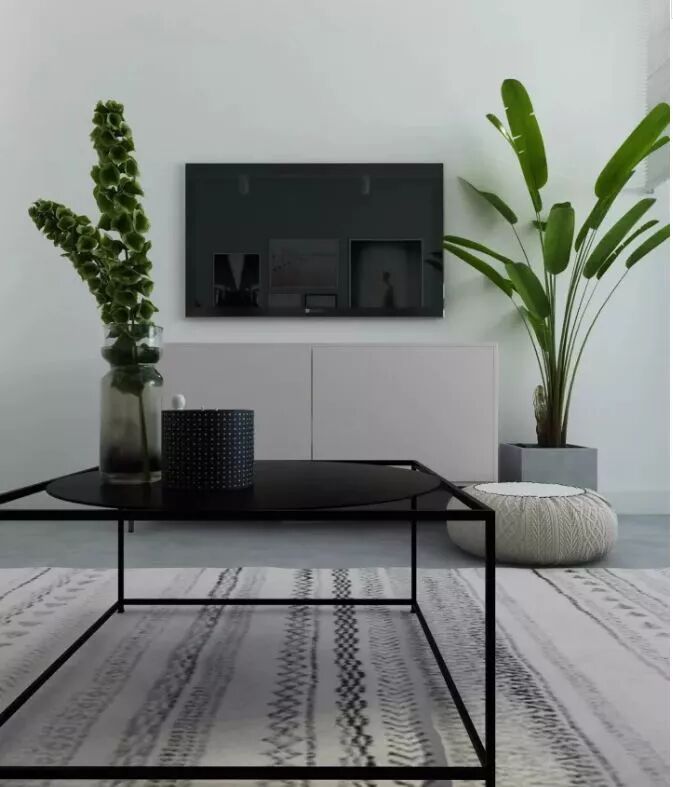客厅水泥灰地面搭配棉麻地毯,几幅不同尺寸的简框画背景,搭配灰色沙发与黑色铁件茶几,空间配合光影的效果,舒适的同时,