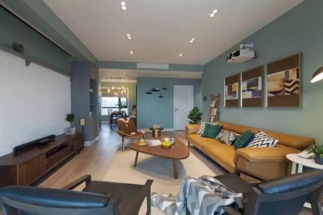本案例中设计师以莫兰迪色系中的绿色系作为空间底妆,软装方面选择了北欧风浓郁的森系家具、饰品,给人以舒适、清爽的视觉体验。门厅处墙面上的小置物架、以及沙发旁静置的短木梯,在强调点缀客厅的同时又能满足一定的功能诉求,透露着设计师精巧的小心思。