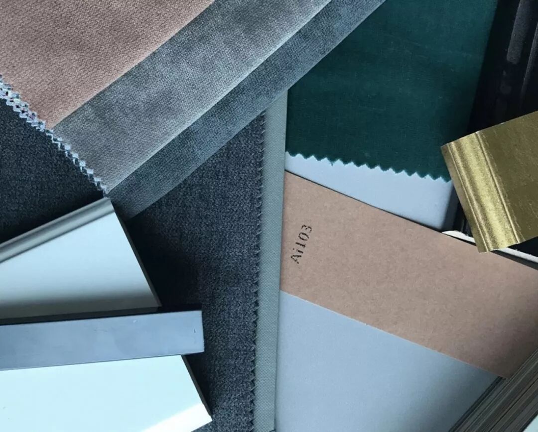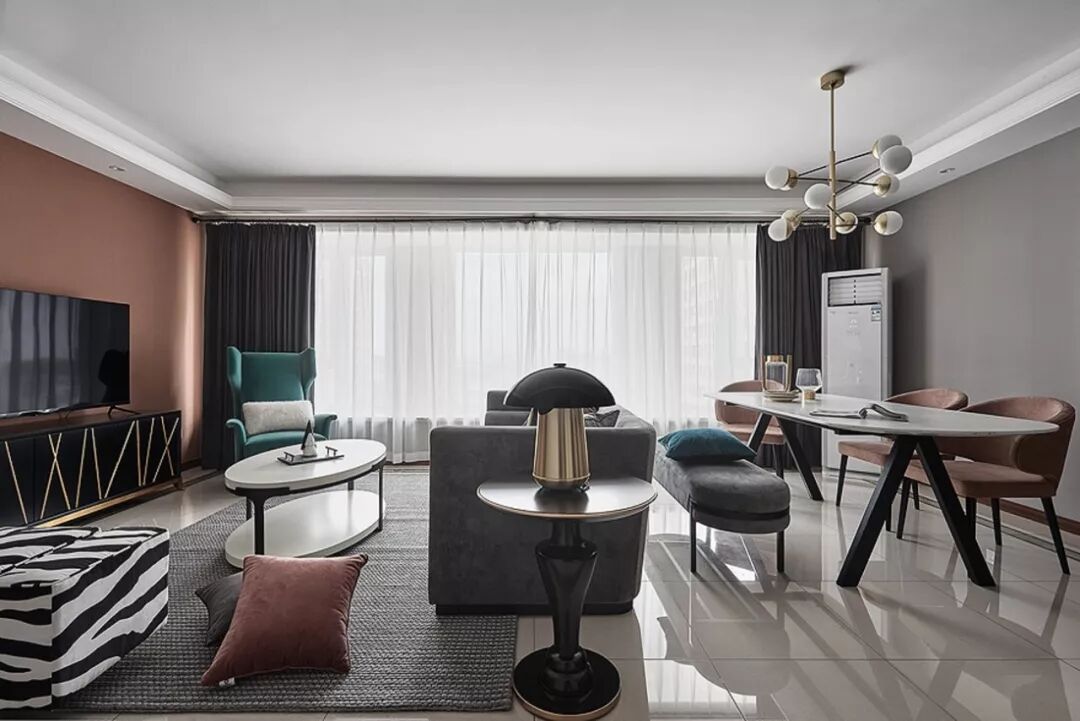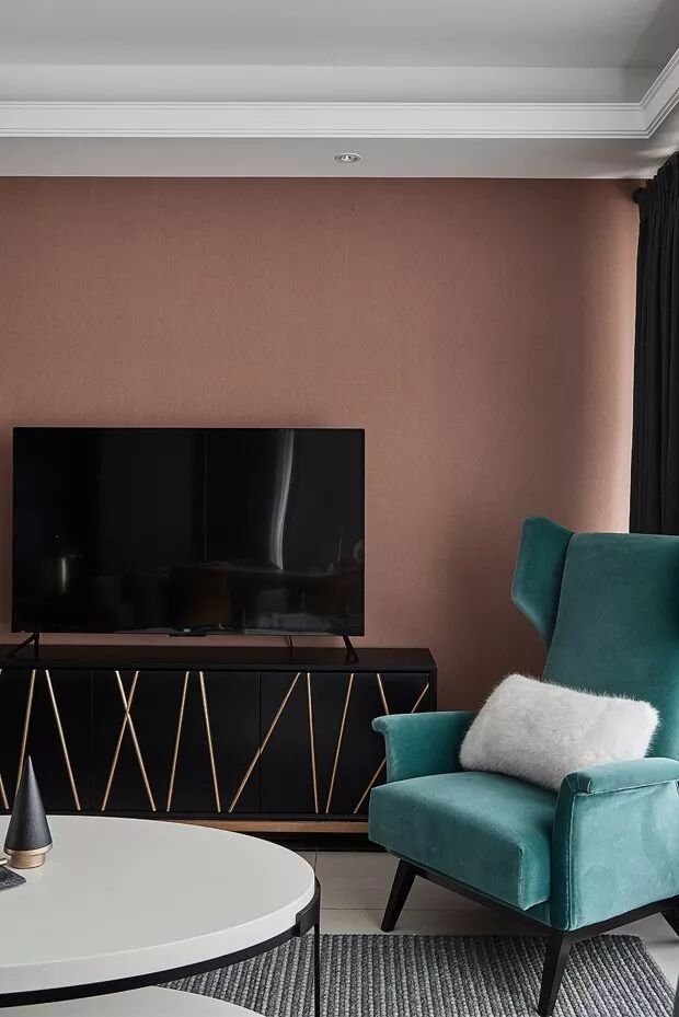 电视机背景墙选择是很正的暖砖色,虽说色彩流行是一轮轮的峰回路转,但暖砖色却一直都在状态,它的饱和度较低、明度适中,与它配以相对比色的是松柏绿的单椅,设计师特意选用绒布面料,不同的角度,呈现不同的效果,同时有带有光泽感,如此一沉稳一端庄的搭配,倒是有一股浪漫气息,电视柜在空间色彩中做了一个很好的折中融合,它是深色结合金色的搭配,增加了氛围艺术。