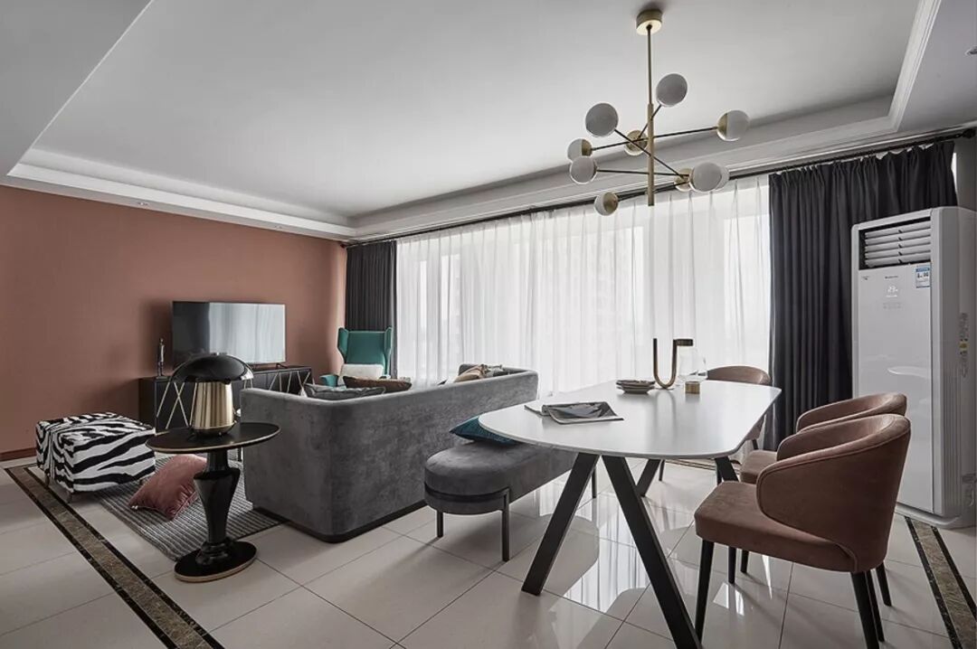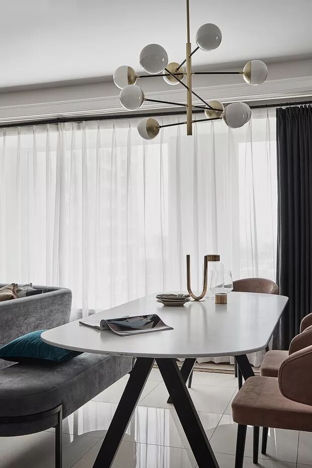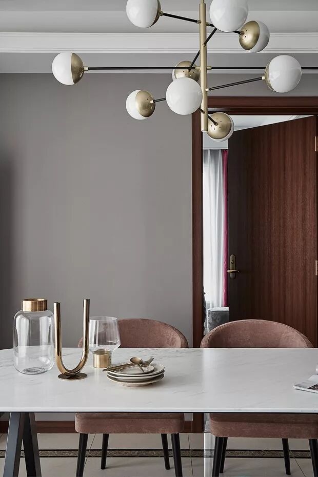 以灰色墙面为背景的餐厅区域,显得安静内敛,黄铜元素的加入,温柔中带着一丝高贵。