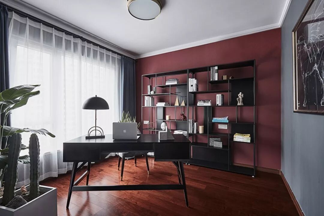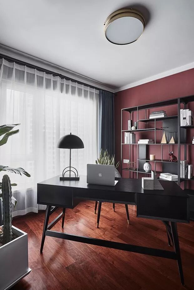 在搭配界里,红色与黑色是最经典的一种搭配色彩,黑色书架和书桌以深红色墙面为背景,视觉上大气典雅,大面积落地窗,给书房带来了很好的采光效果。