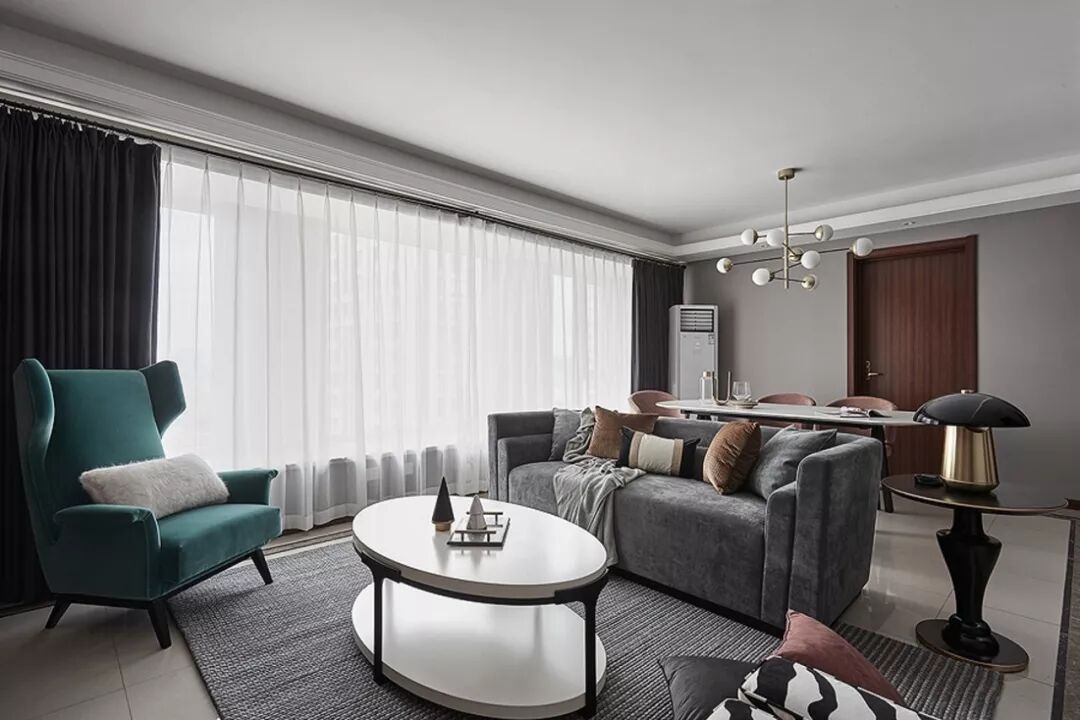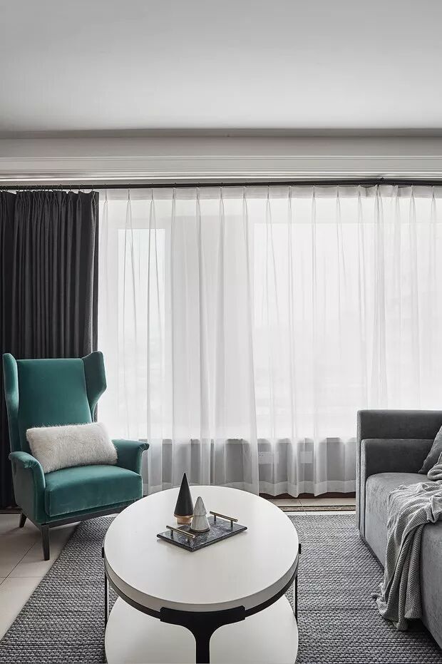 白色窗帘,温柔而又浪漫,绿色作为跳跃色,与白色窗纱相映衬,使得空间清新自然,富有灵性,躺在松柏绿色的沙发上“静心”,微风拂过脸颊,怡然自得。