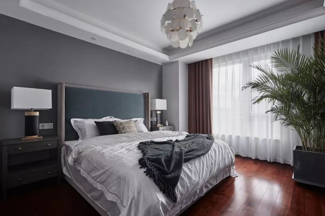 白色永远给人一种纯洁、干净、大方的感觉,白色贝壳样式的吊灯与床品颜色相呼应,唯美浪漫,白色窗帘的搭配,十分的有意境。床头的灰色墙面营造了慵懒的空间氛围,提升了整个空间的格调,床尾绿植的摆放让空间更加惬意温馨,新鲜的色彩点缀,弥漫着生机与活力。