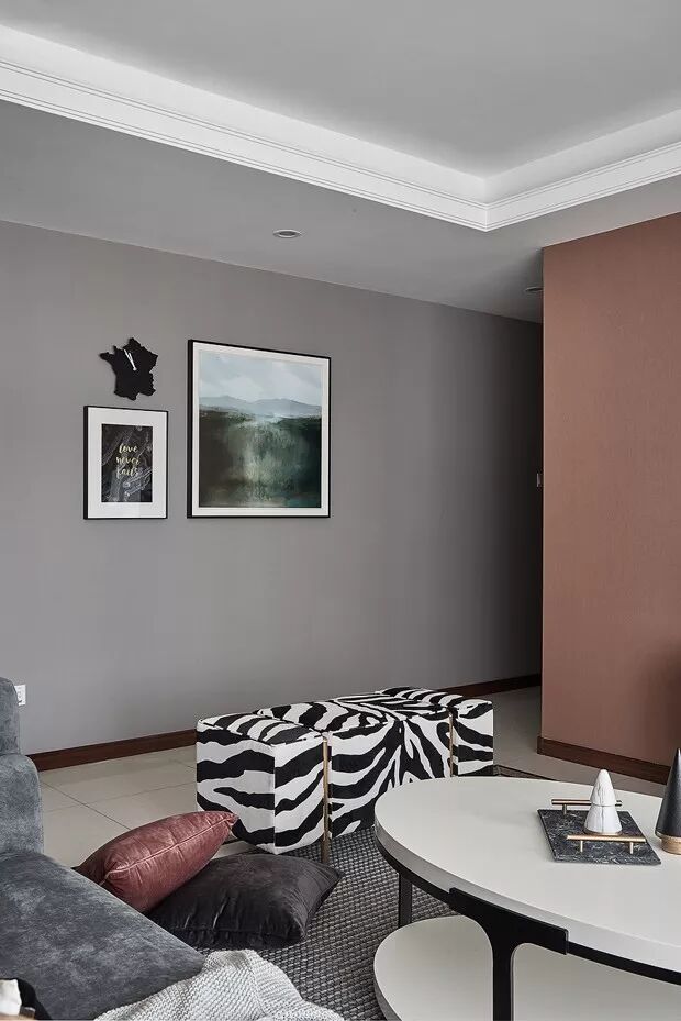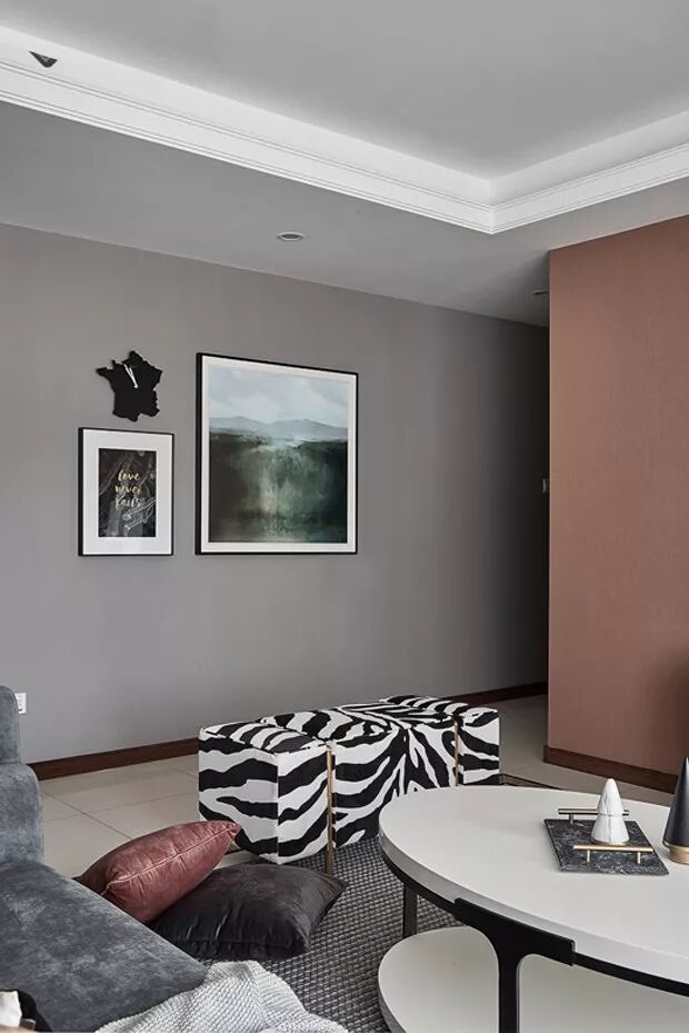 斑马纹加黄铜设计的脚凳,带来摩登气息,墙面的黑边挂画和法国地图装饰钟,与灰色墙面和谐统一。