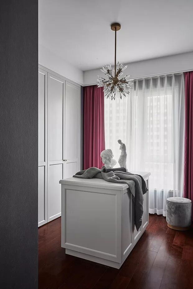 衣帽间整体以素色为主,高级灰门板,简单的线条,玫红色窗帘做了色彩点缀,再搭配上特色水晶灯,如同点睛效果,点亮了整个衣帽间,中岛的设计让衣帽间更加的大气,舒适的换鞋凳,在挑选衣服的同时也能享受到生活的惬意。