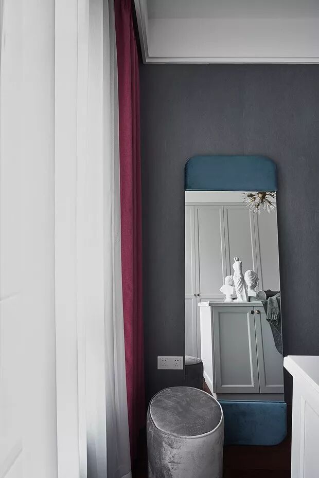 两端带有蓝色设计造型的穿衣镜,是一件实用品也是一件装饰品,灰色的墙面因为穿衣镜的存在不再显得单调,尽显高贵典雅。