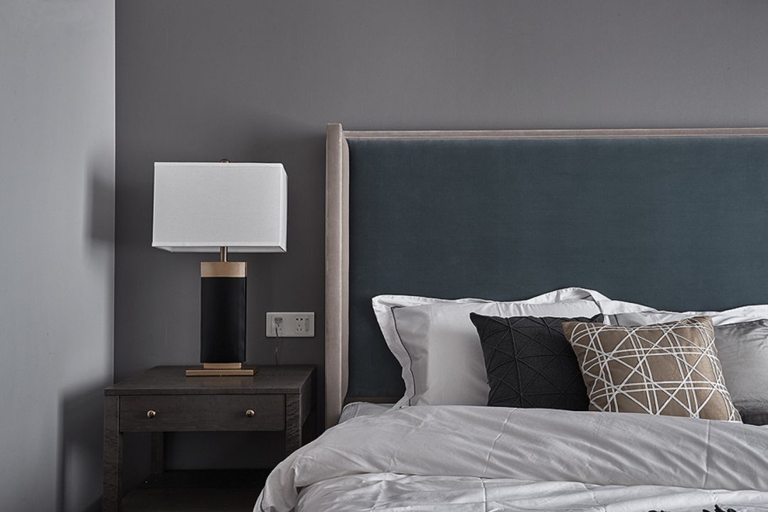 高级灰的床背,包围式设计,美观的同时又更加安全舒适。黑色床头柜,造型别致的台灯,以灰色为背景,黄铜元素的加入,高级感十足。