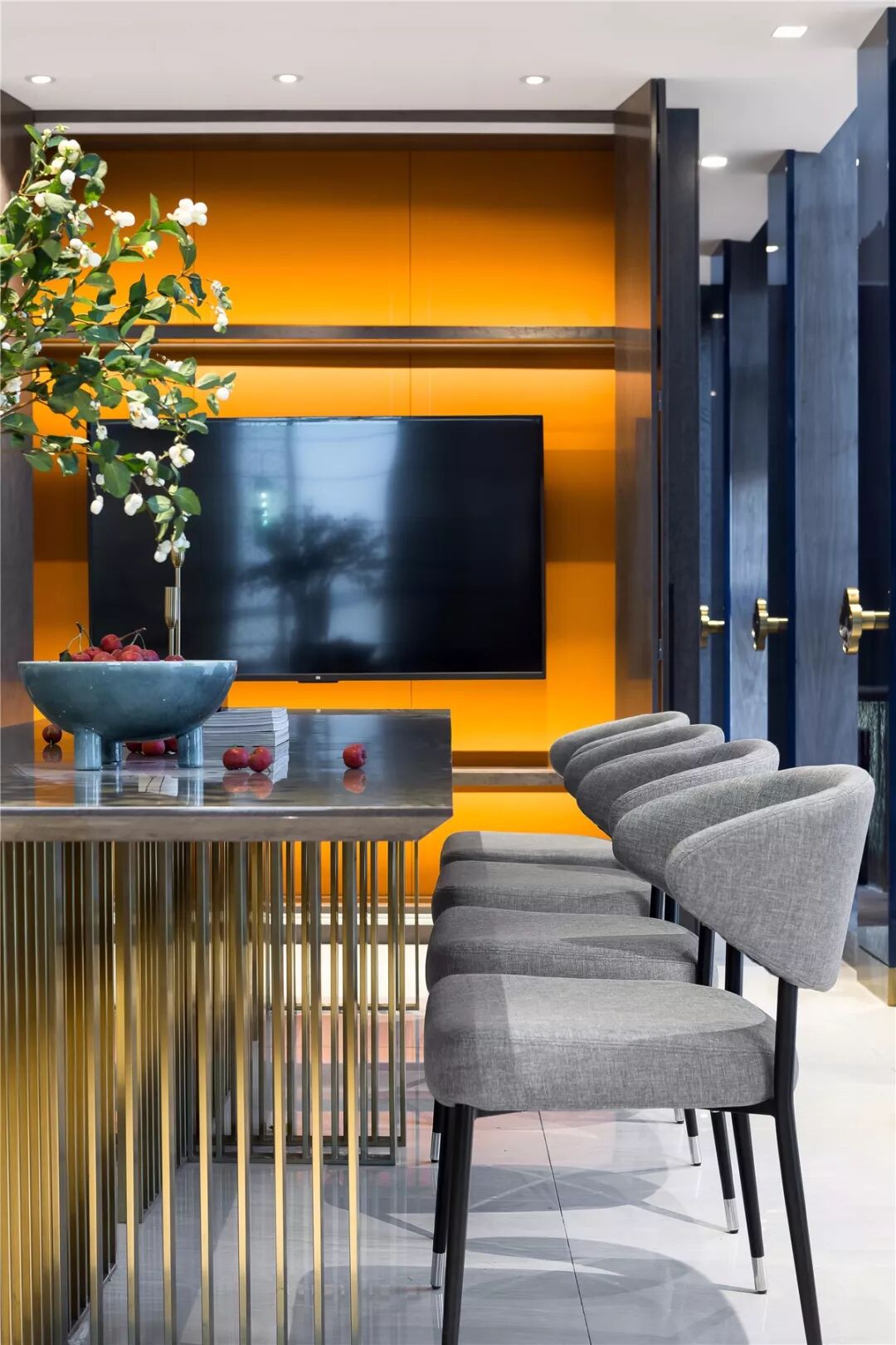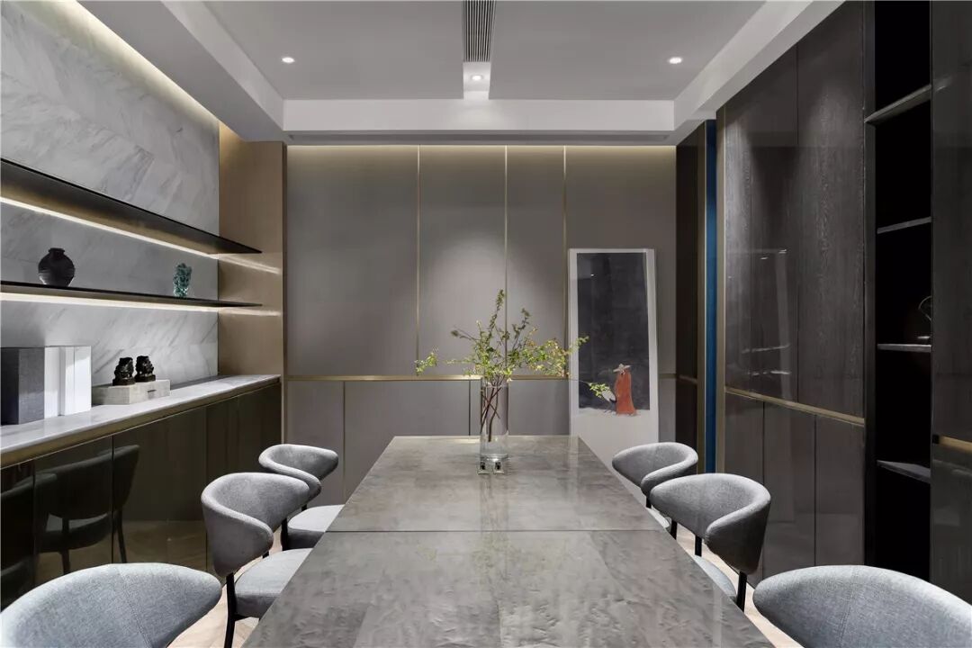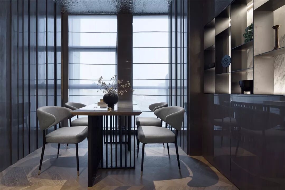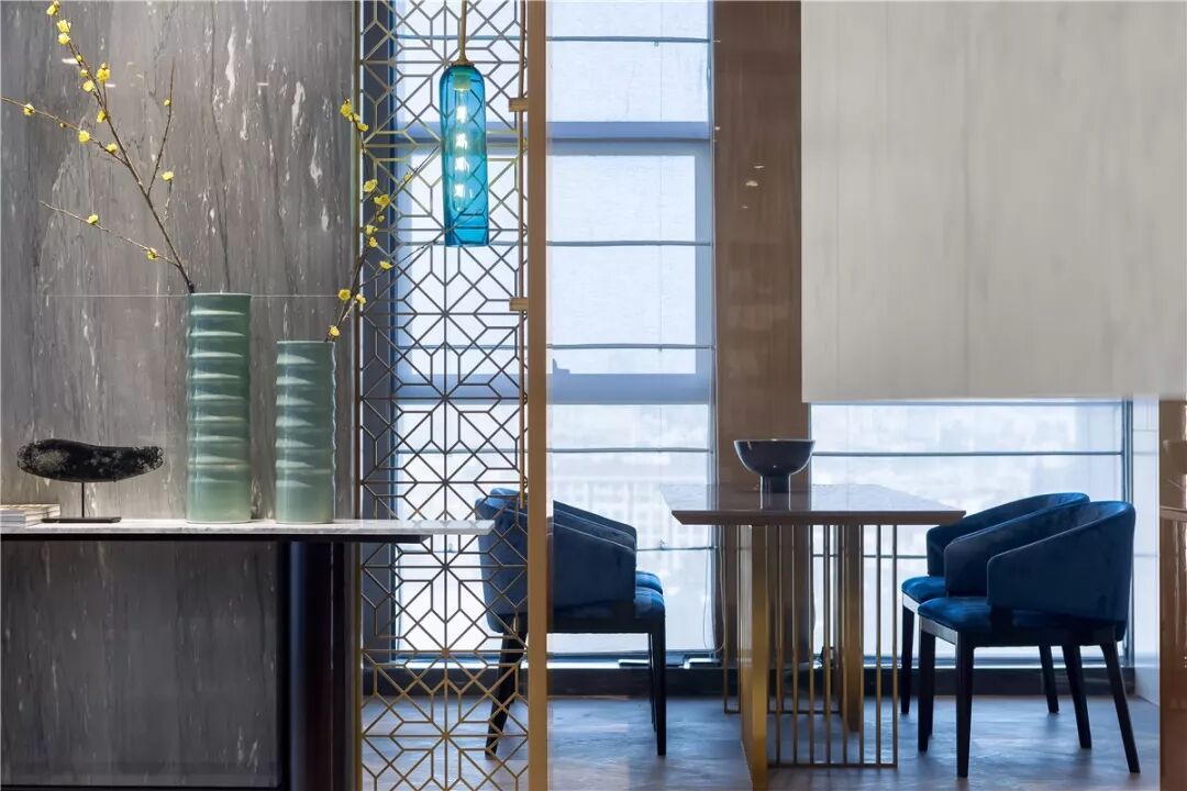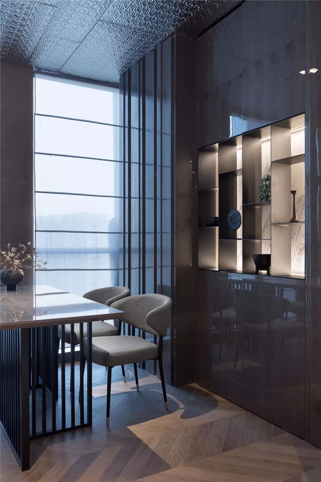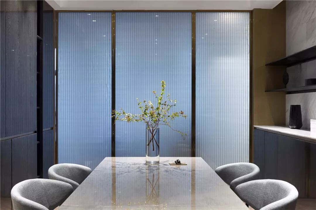 灰蓝色系亚麻质地简椅搭配洁白大理石桌面盈盈自然,室内柔和的光线。带来一种窗明几净的通透感,几株梅花,尽显浓浓的文人趣味,屏风之后又是海纳百川的宽广胸怀。