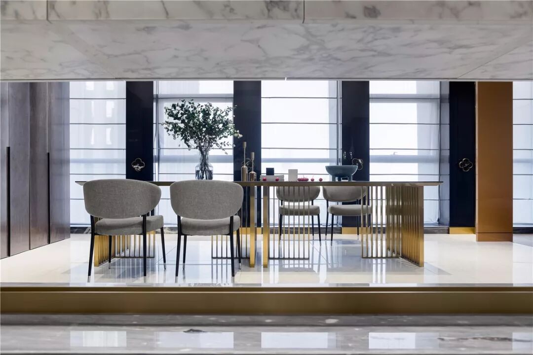 尺与度之间的掌控,色与调之间的柔和在设计师手中变得游刃有余,大理石的高级肌理与黄铜的岁月质感在空间中调和、碰撞,半隐的隔断,影影绰绰,再现经典温婉韵调。