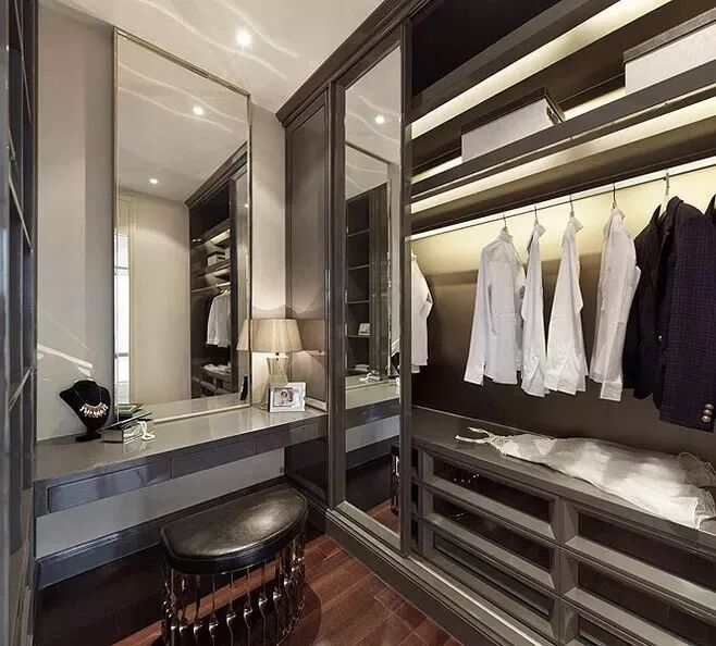 传统衣柜一般是木质的,视觉效果很笨重。而透明的玻璃衣橱,质感透明,折射光芒,给人以梦幻、精致的视觉感。