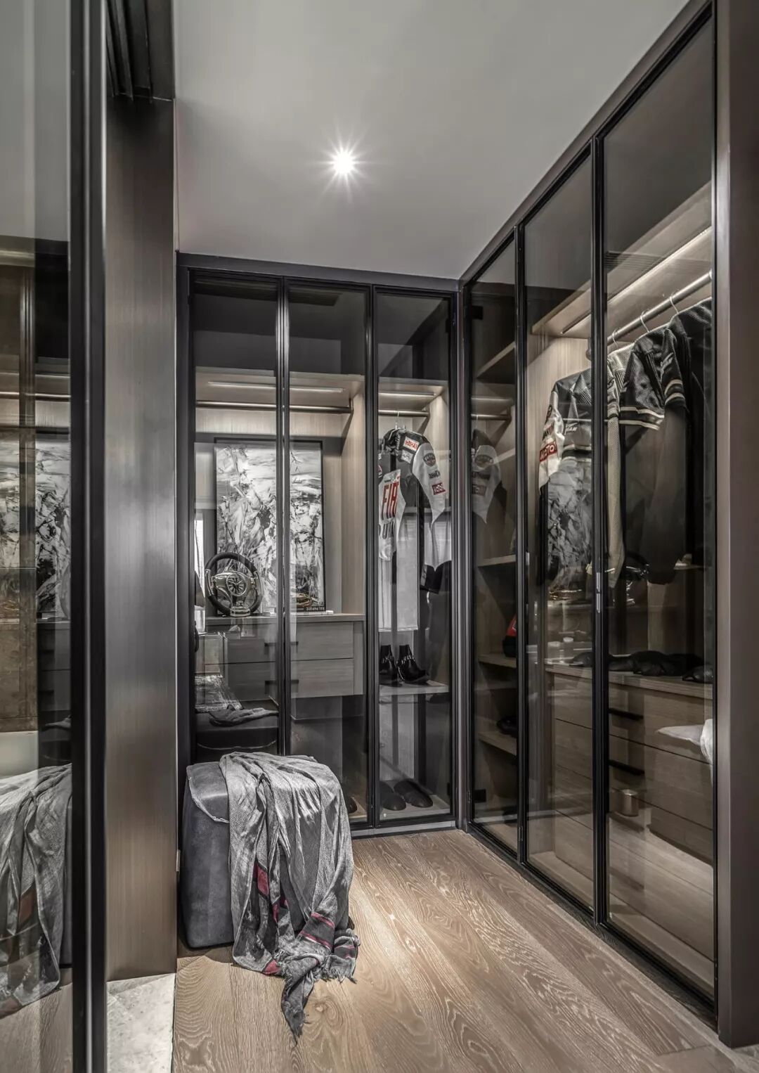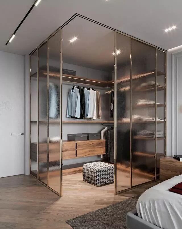 除了全透明的玻璃衣橱,磨砂玻璃衣橱也是精致生活的不二之选。