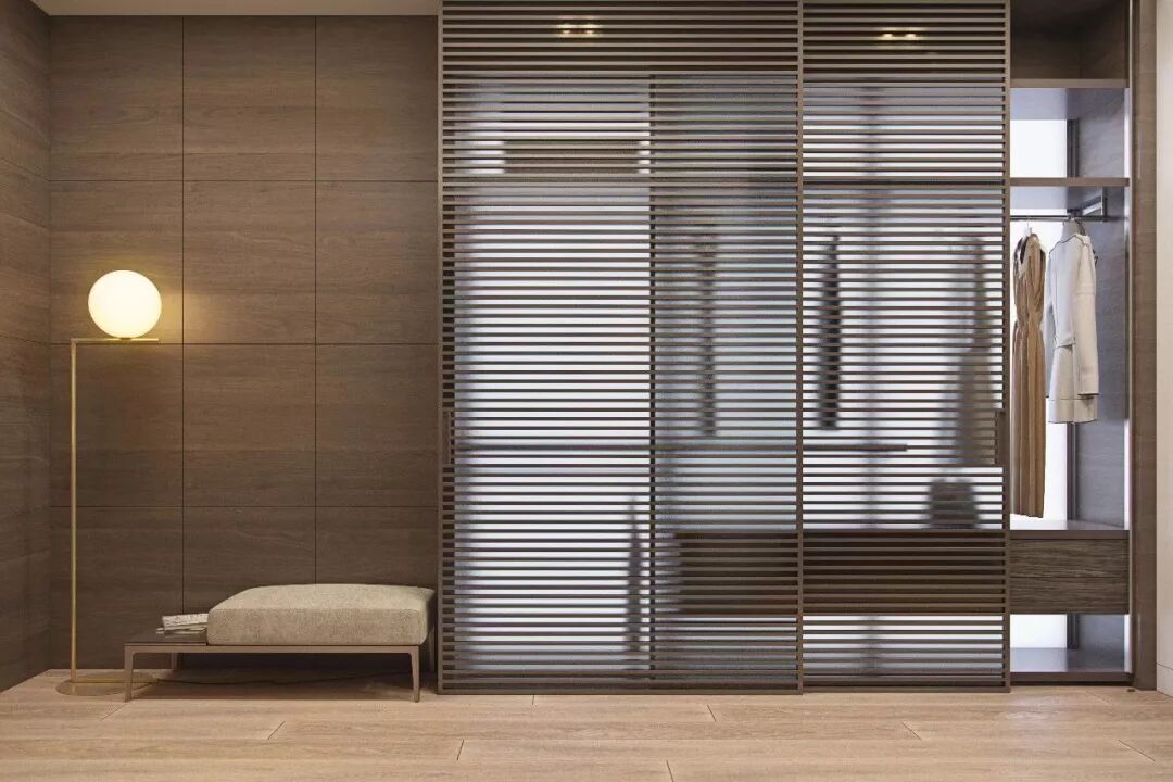 透明衣柜也可以加入木格栅的设计,板条之间隐隐约约的通透感,让视觉效果更丰富。