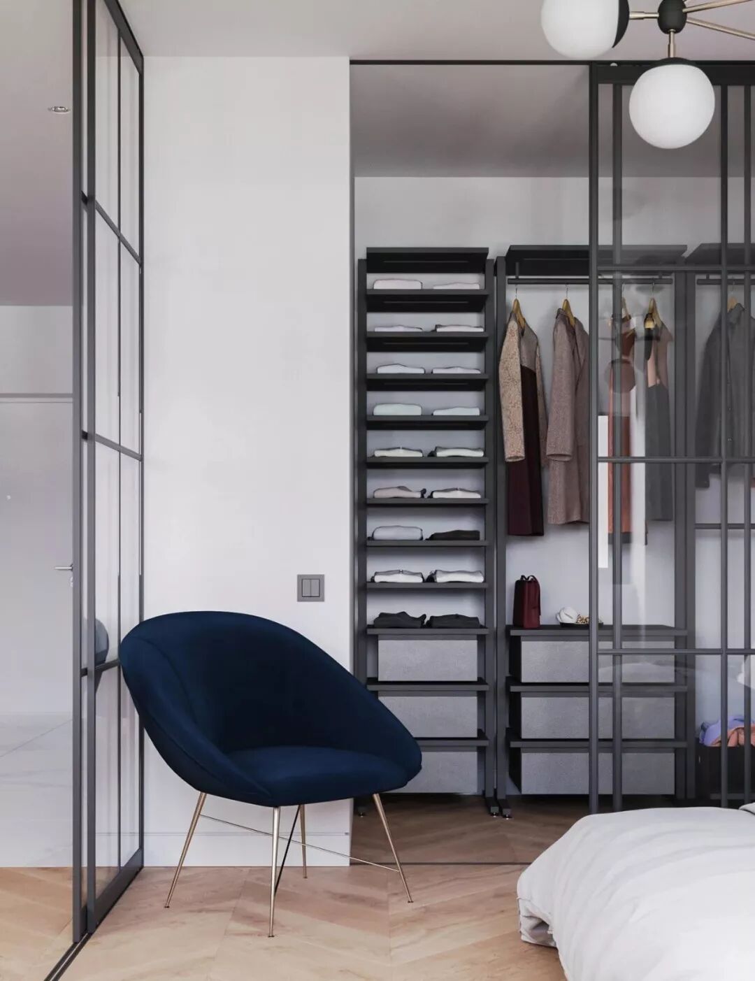黑色的门框,让简单的线条富于灵动;透明的橱门,让衣物就像商店里的展览品,有着闪耀的灵魂。