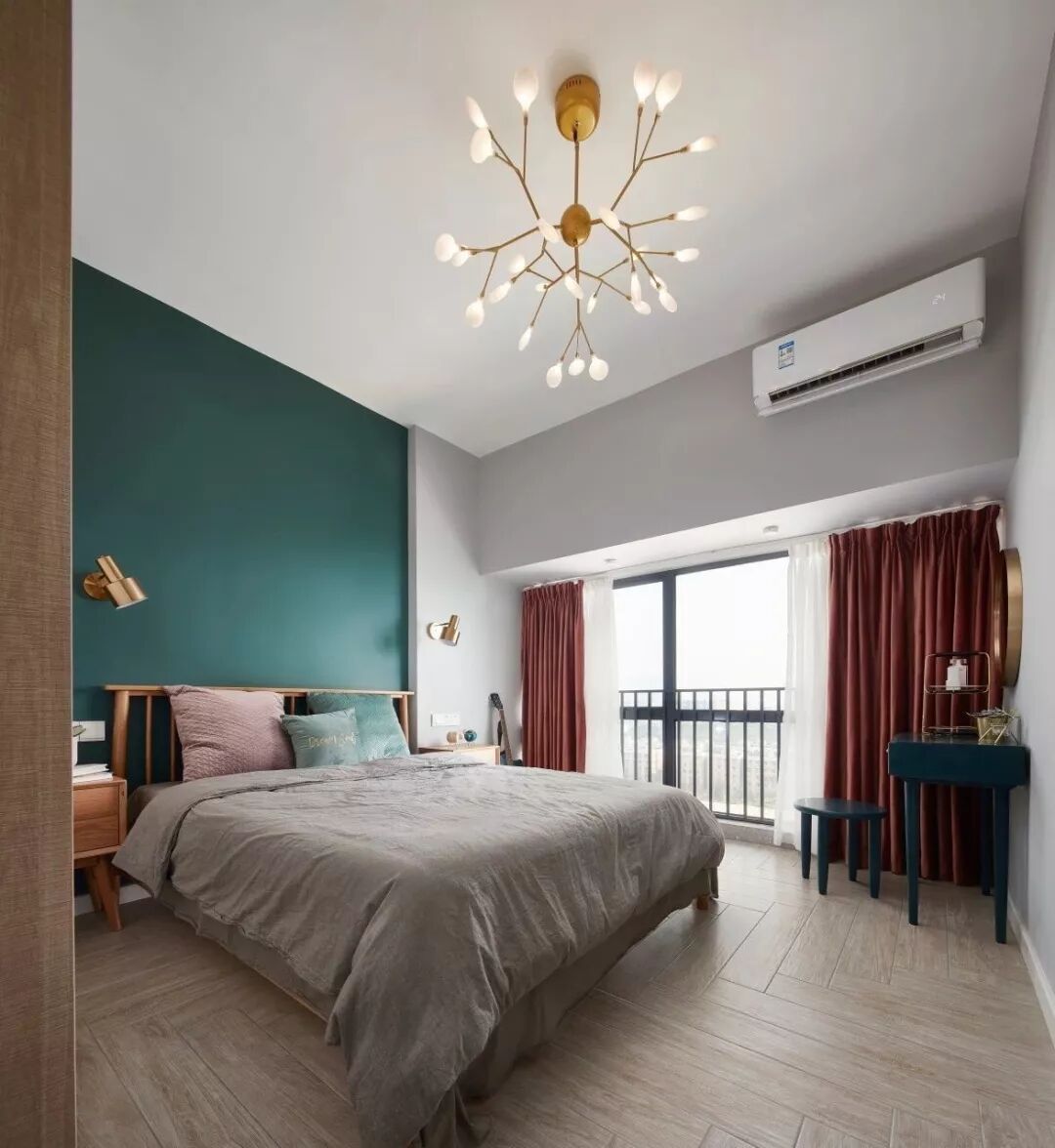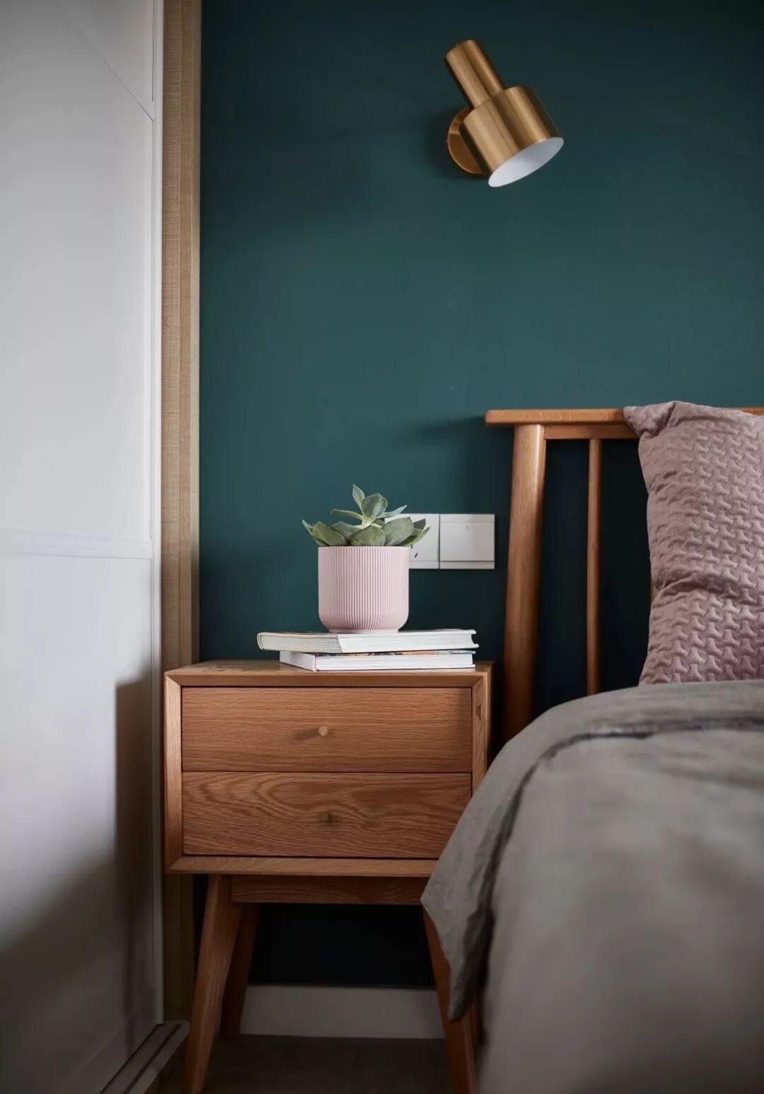 ▲墨绿色的床头背景墙,木质床搭配上灰色床单,一盏花枝般的吊灯挂在上方,整体显得安静而又简约,让人轻松舒适。