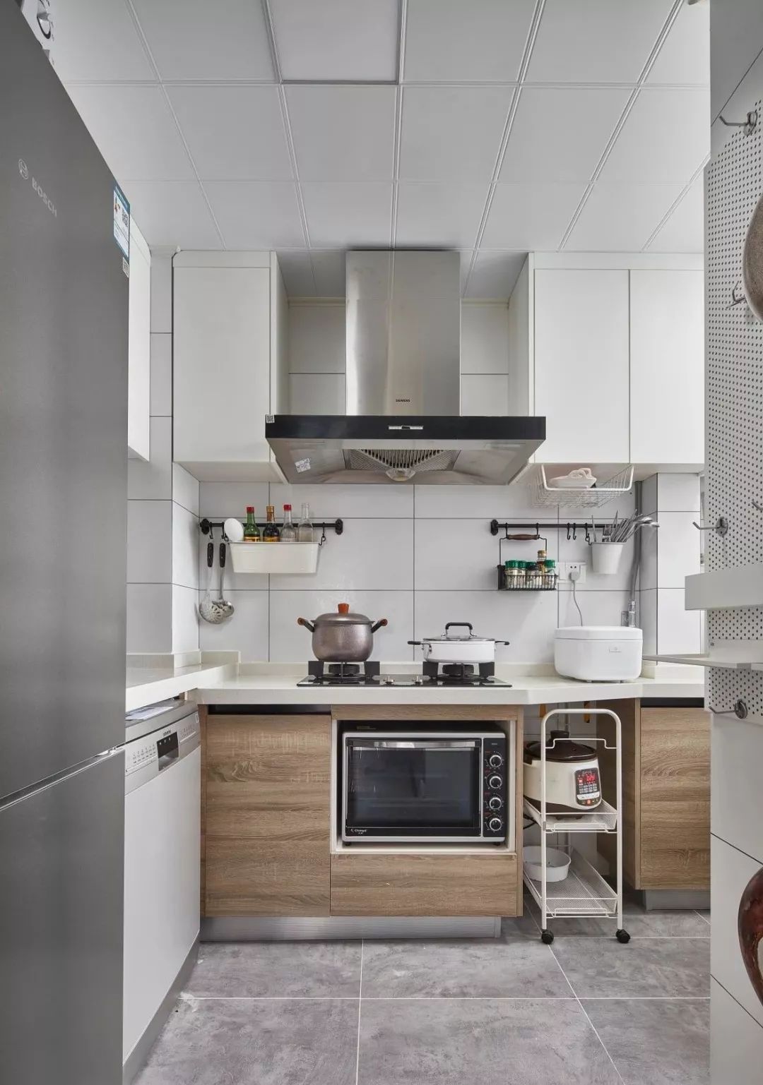 ▲精致的小厨房,巧妙地把各类电器嵌入到橱柜里,还放了一个移动式的料理架,在灰色地砖、白色墙砖与木质橱柜的搭配下,让做饭的心情都轻快无比。