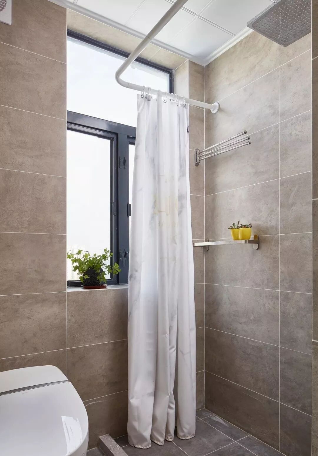 ▲卫生间把洗手盆外置到门外,让卫生间即便有人的情况下,洗手盆也可以使用。 ▲卫生间里面整体灰色哑光的墙面地面砖,以挡水条+浴帘简单地隔断,让小空间平时更加宽敞舒适。