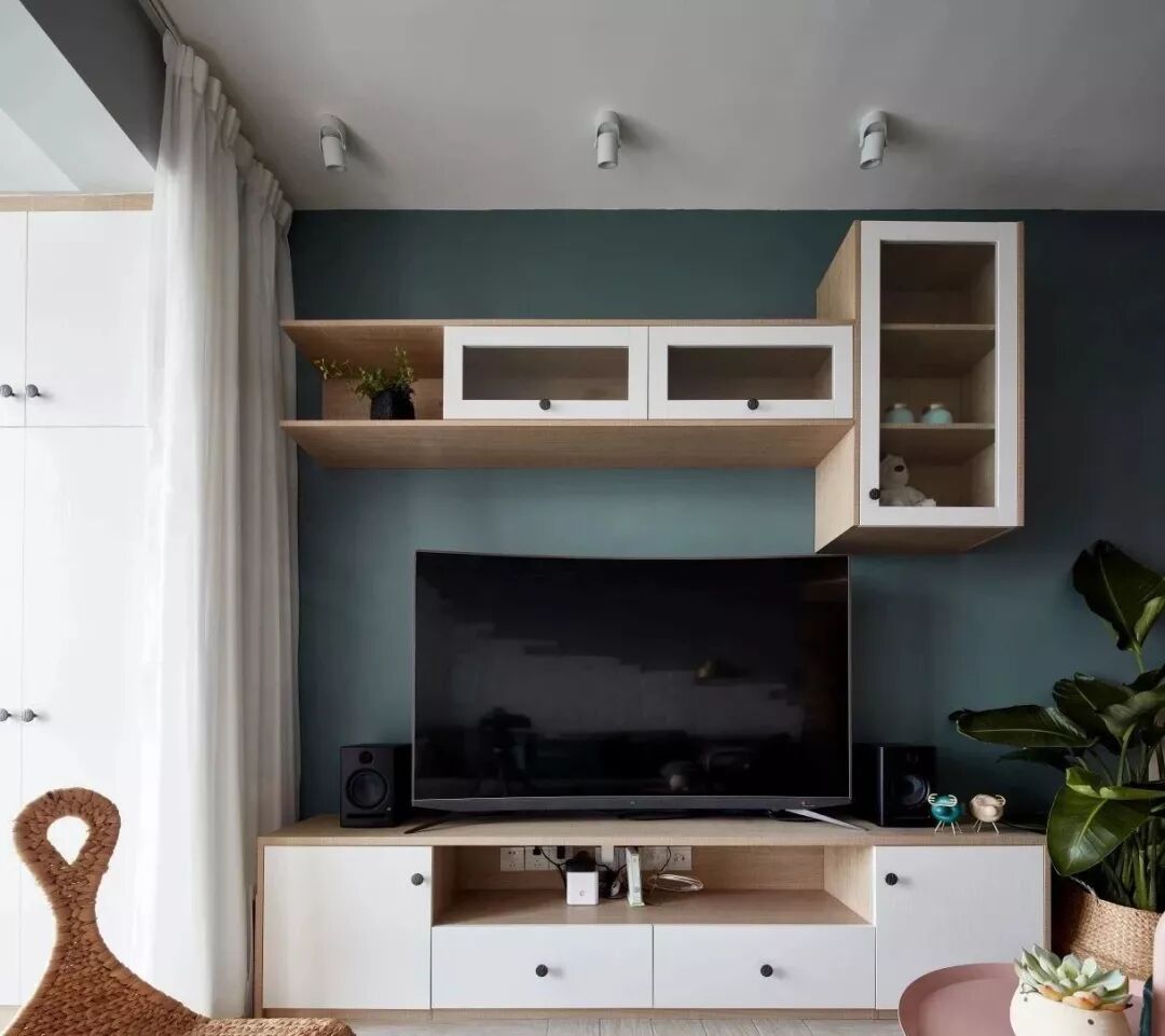 ▲客厅的电视墙背景色与玄关的灰蓝色保持一致,电视柜旁边一盆绿植,结合白色的电视柜与吊柜,带来了一个清新文艺的视觉感。