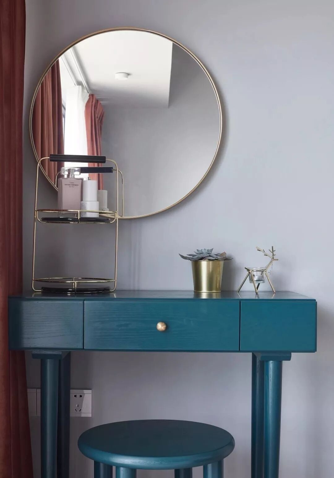 ▲床尾处摆了一个墨蓝色的梳妆台,金属摆件与镜框,搭配粉色的窗帘,温情高档。