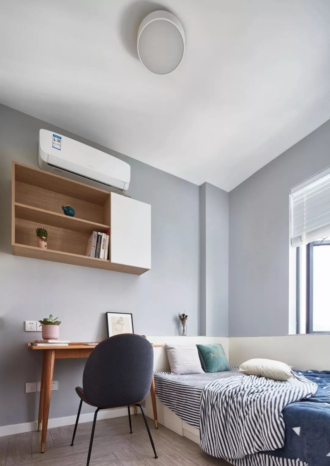 ▲儿童房靠窗摆放一张定制床,蓝白配的床单,轻松自然。床侧边一张书桌与吊柜书架,也为孩子提供了个舒适的写作业看书的位置。