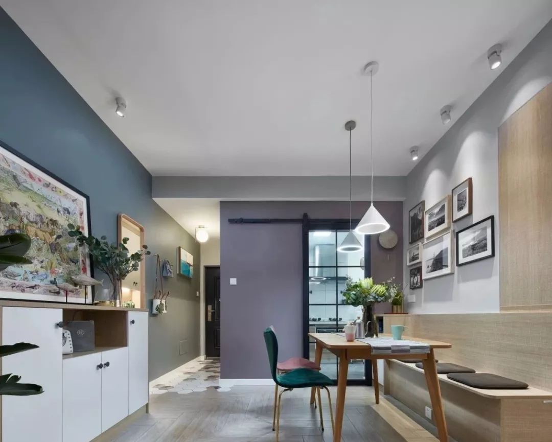 ▲过了玄关就进入了餐厅,紫色厨房墙面搭配黑色谷仓门,让餐厅空间有着更加灵动的交流。