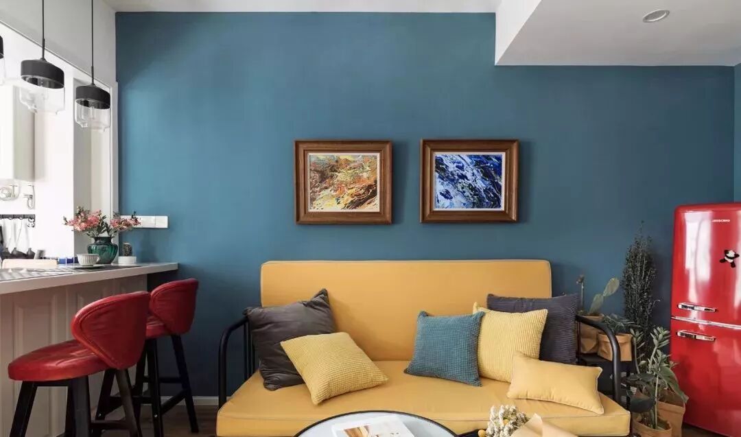 孔雀蓝色的沙发背景墙搭配明黄色的沙发,冷色调搭配暖色调,优雅富有魅力的孔雀蓝,而明亮的黄色则会有一种温馨阳光的气息,冷暖相宜的色调将美轮美奂的家居意境尽情渲染。