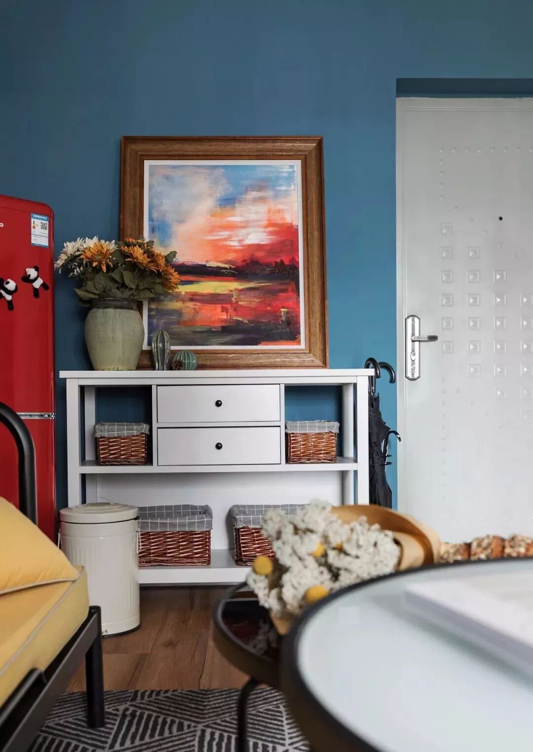 入门没有特定设置玄关,而是放置了一个玄关柜。向日葵搭配色彩绚丽的油画,很有艺术气息。
