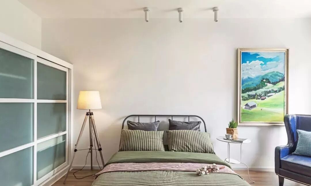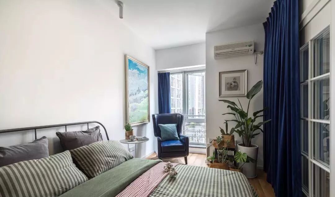 有点文艺气息的铁艺床架,简洁没有厚重感,搭配自然色系的床上用品,以及床尾的绿植,轻巧舒适由然而生。