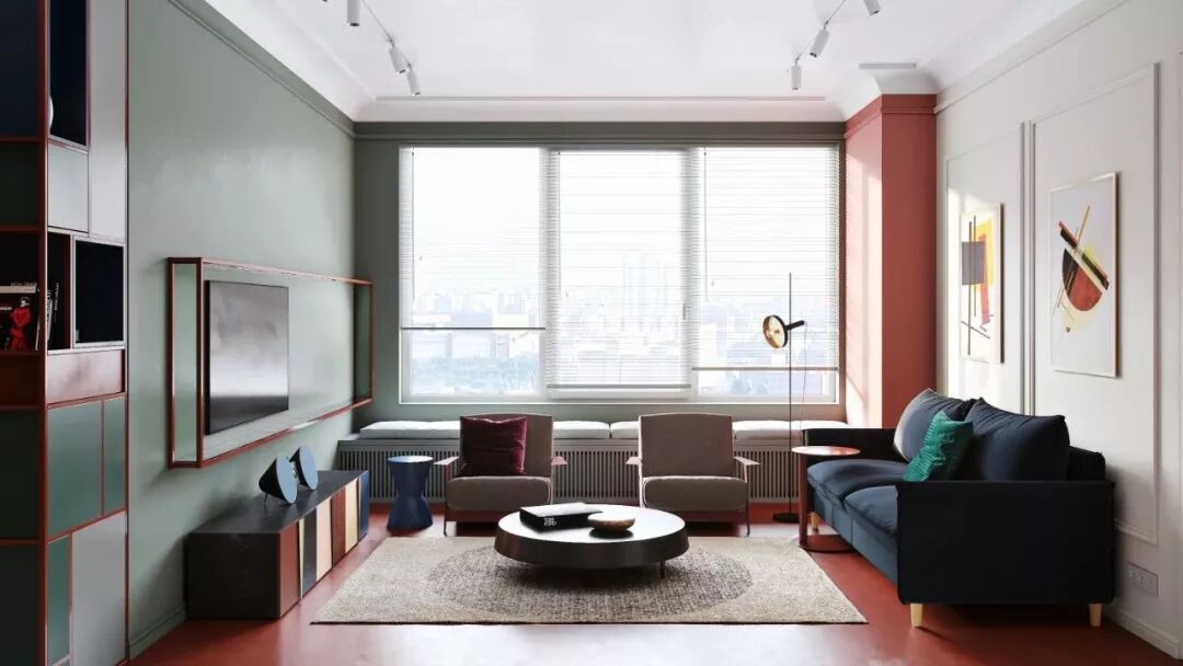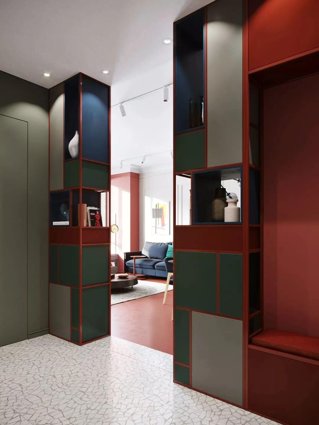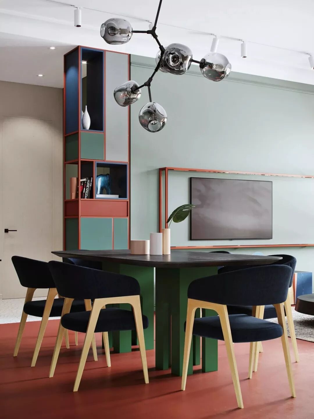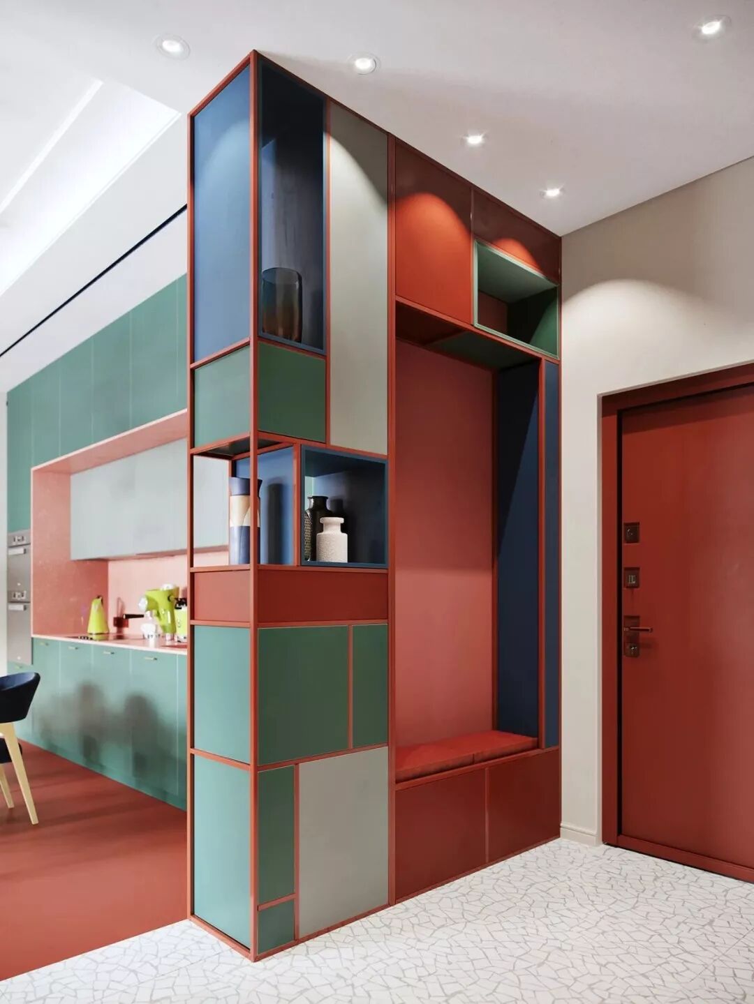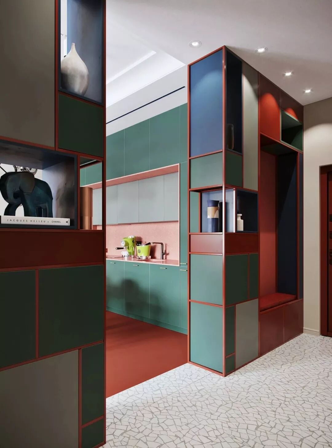色彩搭配一直是家居装修中非常重要的一课, 色彩决定着整体的风格, 清新明快的色调能让人的心情也变得轻快起来。 位于莫斯科的住宅 面积为 80㎡ 运用了大量色彩 打造生机盎然的家 门口的柜墙由红/绿/蓝组成 同样是整个房子的主要色调 红色大门搭配起来也十分和谐 这样的色彩的搭配在视觉上会有一个对比,更有层次感。 柜墙中可以放置一些摆件 还隔出来一块区域 进出门时能坐着换鞋 水磨石地面时髦又清洁 通过一个小小的玄关 来到客厅/厨房构成的开放式区域 橘红色的地面分外抢眼 苔藓绿橱柜提供了大量的储物空间 与边上绿色的餐桌腿相呼应 一体式的橘粉色防溅台也恰到好处 水池富有设计感 烟灰色水龙头也充满格调 餐桌可容纳 6 个人 上方不规则的灰色透明玻璃吊灯 为这个区域营造了艺术的氛围 深蓝色布面餐桌椅与深色木质桌面 显得深沉大方 完美中和了周围的众多明亮色彩 客厅区域采光良好 浅绿色的背景墙很好的衬托了多彩的木制电视柜 橘红色的长方形钢架嵌入玻璃板 也可摆放CD等小物件 正对着电视的蓝色布艺沙发 搭配了红色小边桌 茶杯/遥控机就不用放到大茶几上去 金色的圆形落地灯富有几何感 与两幅挂画相呼应 一旁的两个单人沙发后还有一排飘窗 不用担心客人来了没地方坐啦 马桶和浴缸一侧的墙上 都做了黑色的壁龛 方便放一些洗漱用品