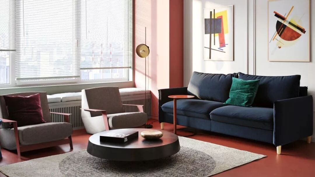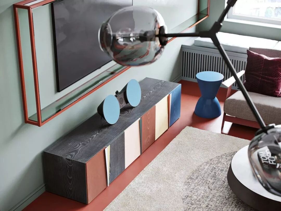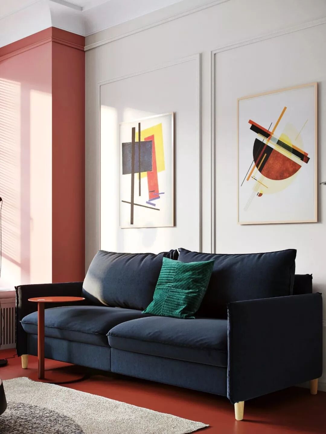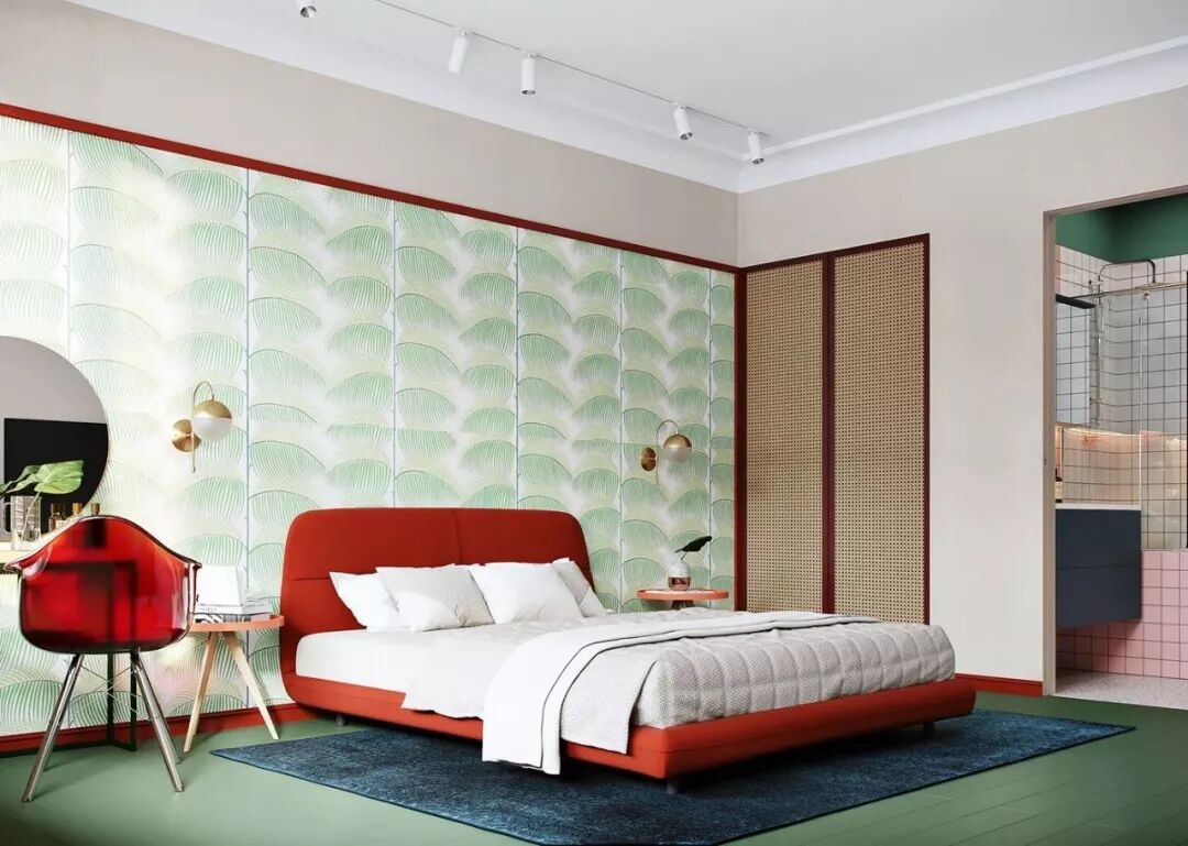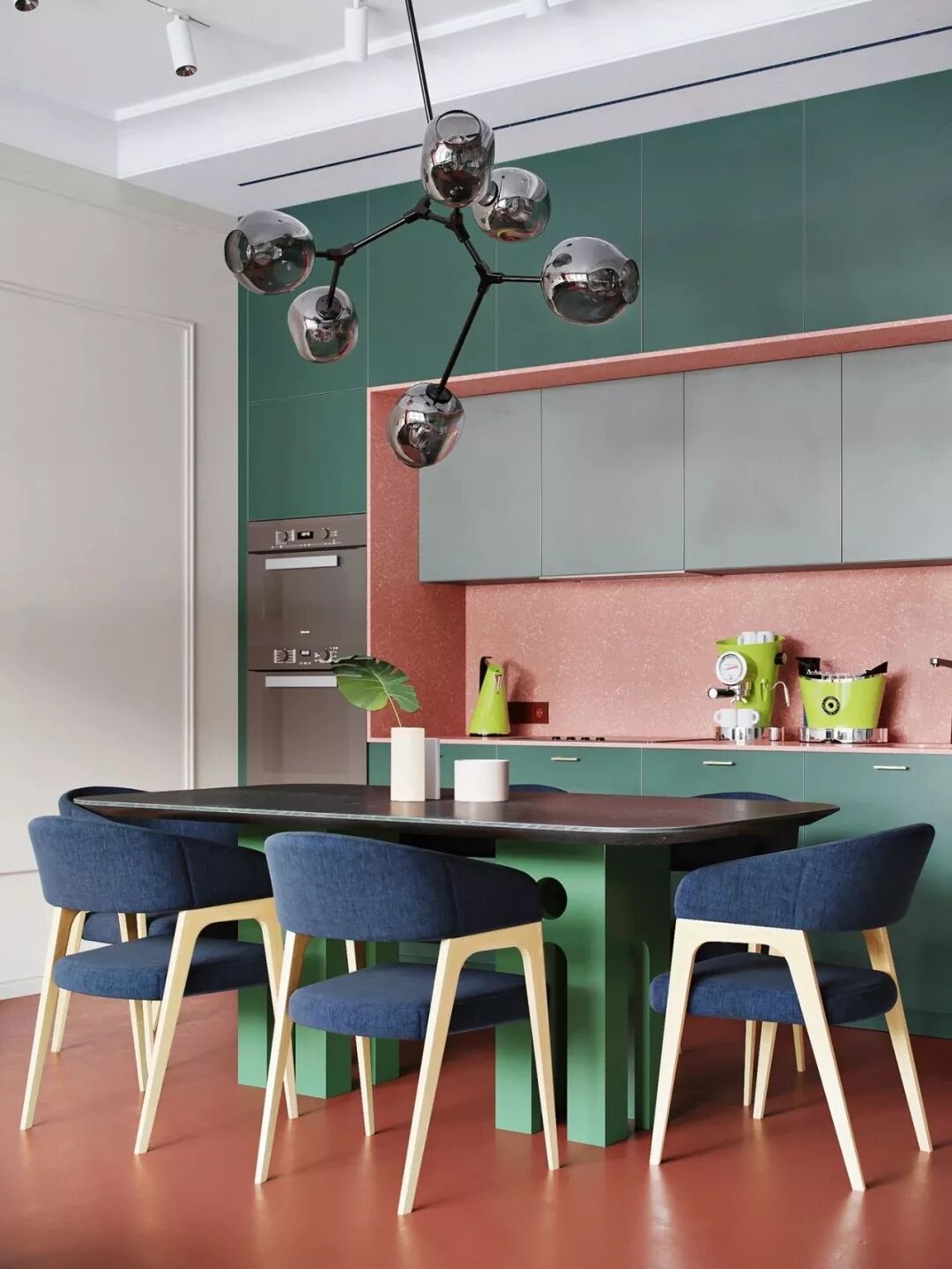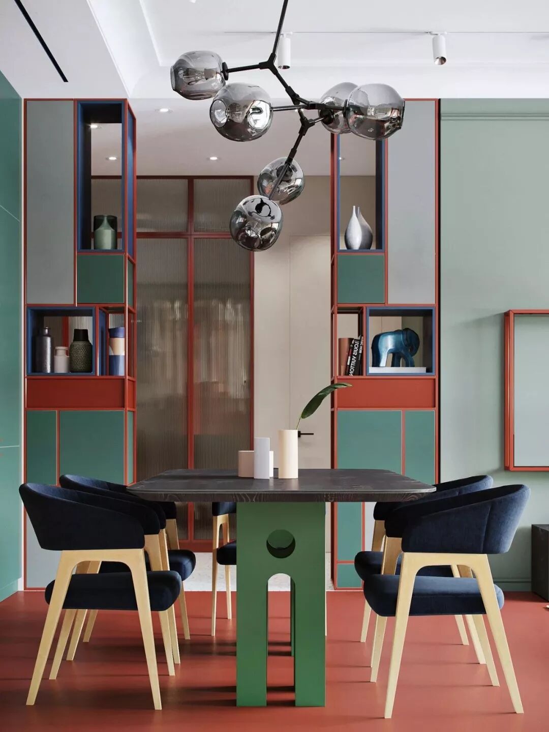 色彩搭配一直是家居装修中非常重要的一课, 色彩决定着整体的风格, 清新明快的色调能让人的心情也变得轻快起来。 位于莫斯科的住宅 面积为 80㎡ 运用了大量色彩 打造生机盎然的家 门口的柜墙由红/绿/蓝组成 同样是整个房子的主要色调 红色大门搭配起来也十分和谐 这样的色彩的搭配在视觉上会有一个对比,更有层次感。 柜墙中可以放置一些摆件 还隔出来一块区域 进出门时能坐着换鞋 水磨石地面时髦又清洁 通过一个小小的玄关 来到客厅/厨房构成的开放式区域 橘红色的地面分外抢眼 苔藓绿橱柜提供了大量的储物空间 与边上绿色的餐桌腿相呼应 一体式的橘粉色防溅台也恰到好处 水池富有设计感 烟灰色水龙头也充满格调 餐桌可容纳 6 个人 上方不规则的灰色透明玻璃吊灯 为这个区域营造了艺术的氛围 深蓝色布面餐桌椅与深色木质桌面 显得深沉大方 完美中和了周围的众多明亮色彩 客厅区域采光良好 浅绿色的背景墙很好的衬托了多彩的木制电视柜 橘红色的长方形钢架嵌入玻璃板 也可摆放CD等小物件 正对着电视的蓝色布艺沙发 搭配了红色小边桌 茶杯/遥控机就不用放到大茶几上去 金色的圆形落地灯富有几何感 与两幅挂画相呼应 一旁的两个单人沙发后还有一排飘窗 不用担心客人来了没地方坐啦 马桶和浴缸一侧的墙上 都做了黑色的壁龛 方便放一些洗漱用品