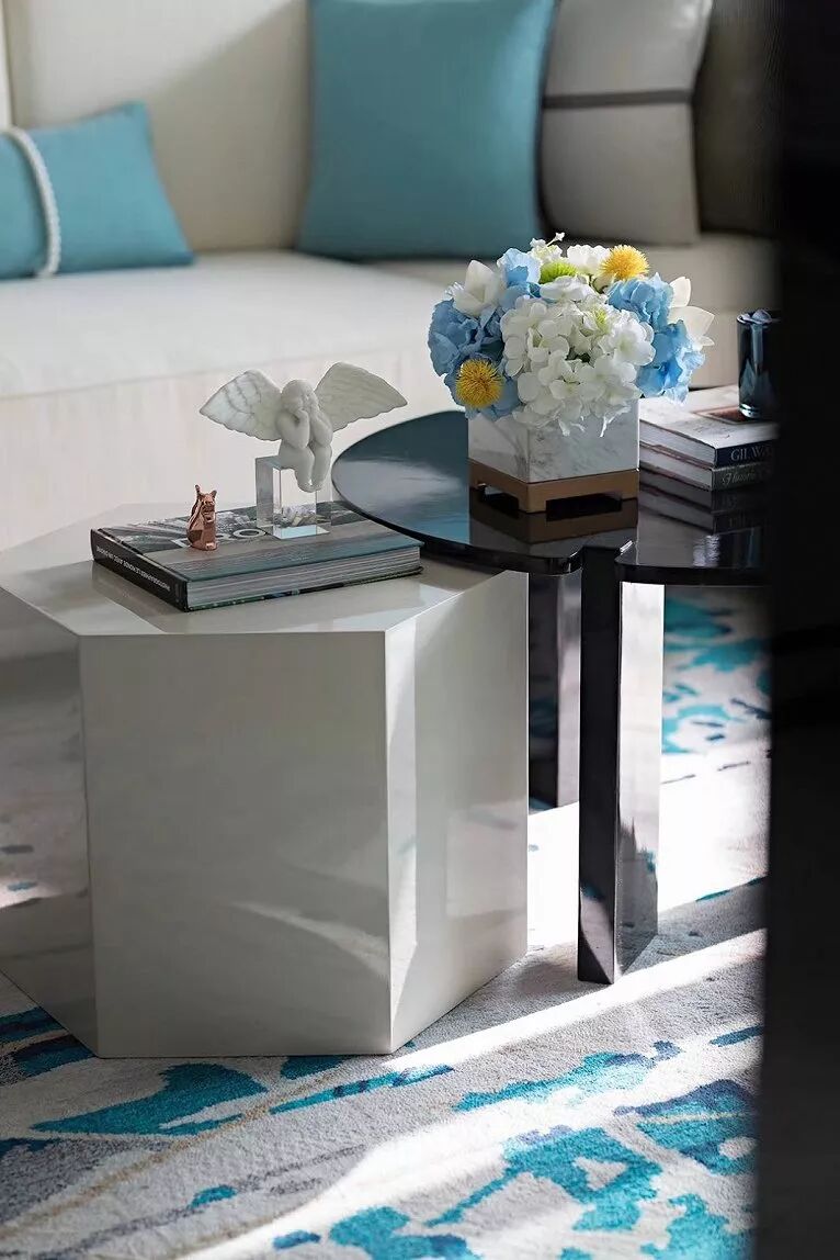蒂芙尼蓝是一种十分讨巧的颜色,也是收获浪漫爱情的象征。蒂芙尼蓝被泼洒于各类家居有用品中,使得空间视觉平衡,而明亮通透的客厅搭配上它,更让人眼前一亮。