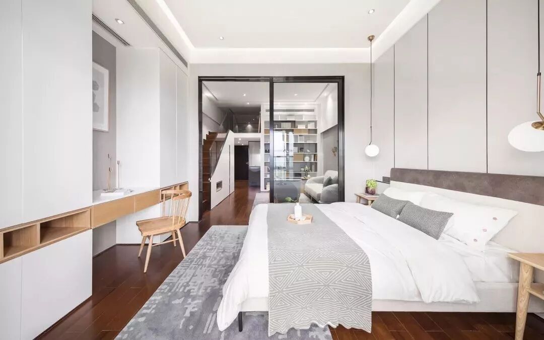 越来越多的年轻人喜欢LOFT, 不单单是建筑本身, 更是因为LOFT带来的一种生活方式。 一个超酷的复式结构让小户型住宅, 变成两层的“小豪宅” 合理设计,能让家居空间更为方便紧凑, 是时下最流行的住宅装饰范儿。 LOFT具有很大的灵活性 我们可以根据自己的个性需求 随心所欲地决定家的风格和布局 赋予它个性化的审美情趣 从而创造出自己梦想中的生活 装修设计Loft时 要尽量少用隔断 使用推拉门代替墙体 也可以起到很好的空间分割作用 让空间看起来更开阔整洁 就算空间再局促 也需要有一组落落大方的收纳柜 巧妙的嵌在墙体里并不占用活动空间 错落且有致的层架或藏或示 充分利用小搁楼楼梯底下的空间 把收纳柜合理的切分 以便生活起居的各种生活用品 得以完全很好的储藏,而不会浪费空间 阁楼虽然面积不大, 但是用心拾掇你会发现, 这方寸大小的地方利用起来 也可以自成一片天地,悠然自得 朋友小聚偶尔借宿一宿也是常有的事 白色系的卧室自然清爽 可以营造出非常放松和宁静的氛围 漫长的一天工作结束后 这里才是真正的庇护所 床头两侧的非常有型的小吊灯 释放安静的力量 开放的床头柜上 腾出来可以摆放精致的小手工制品 素白的两组衣柜中间拓开来的尺许空间里 满足对生活热爱的激情