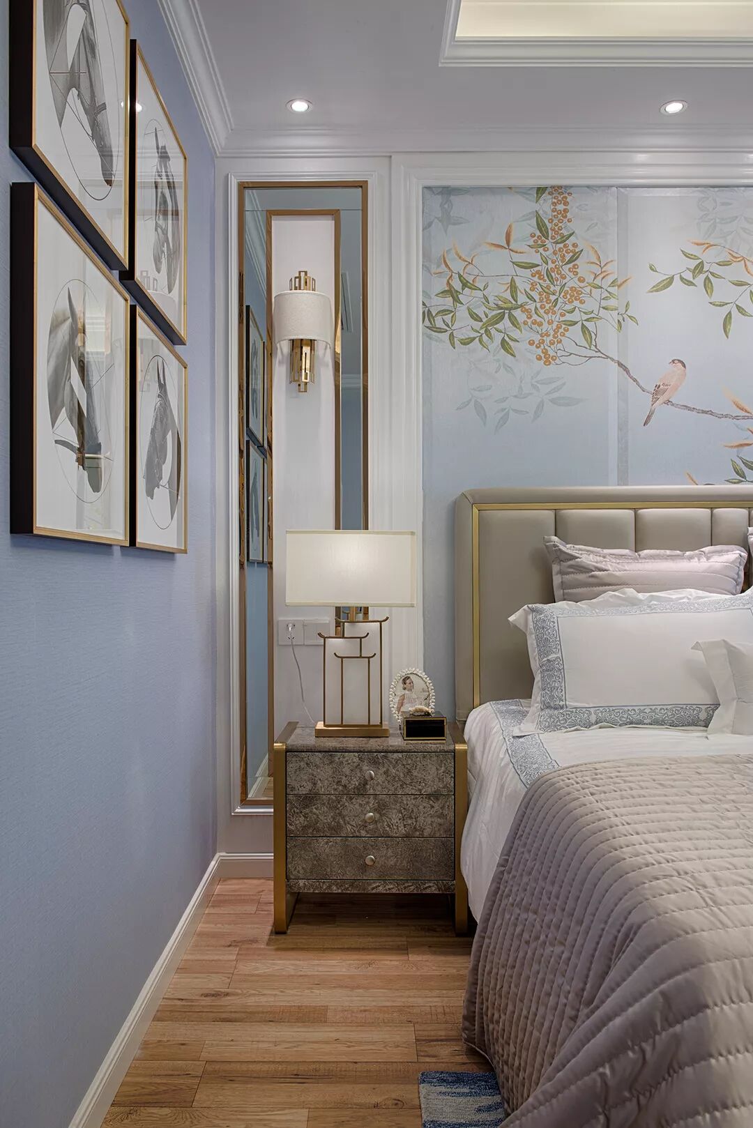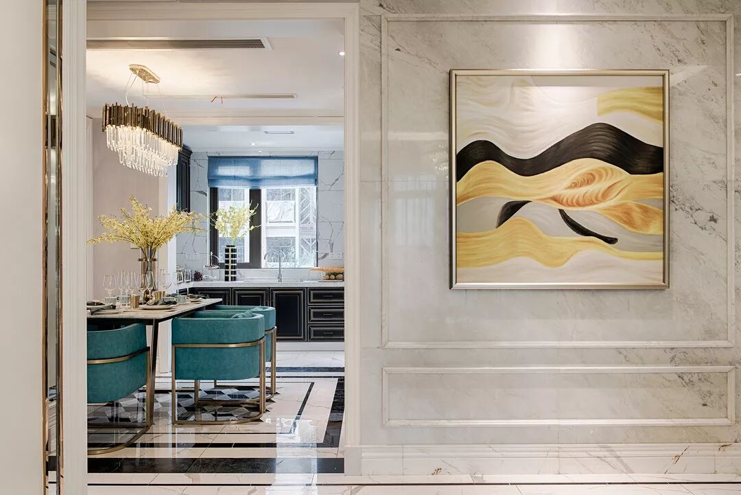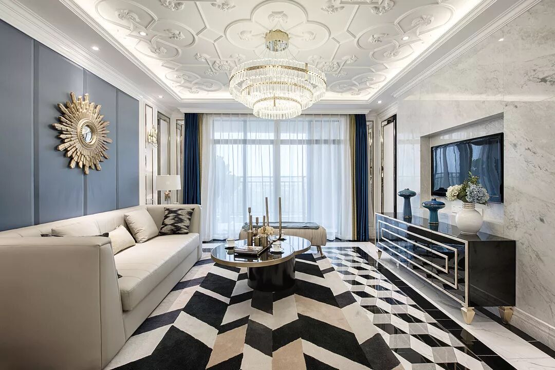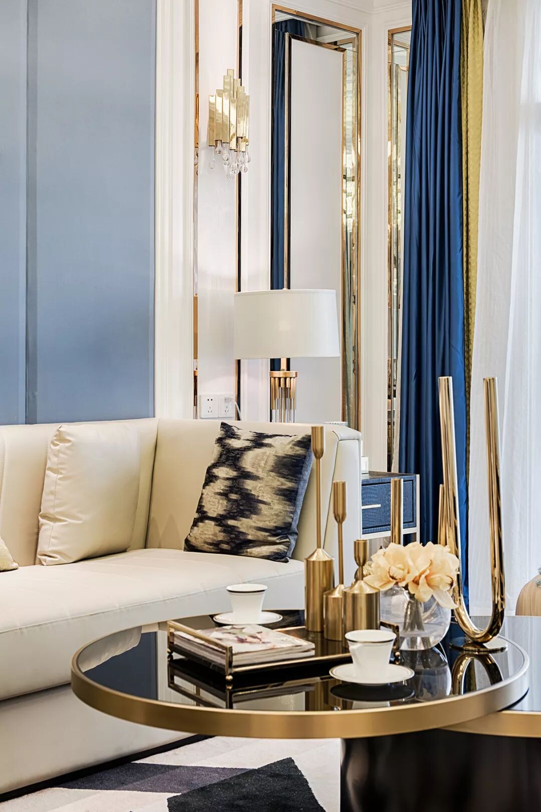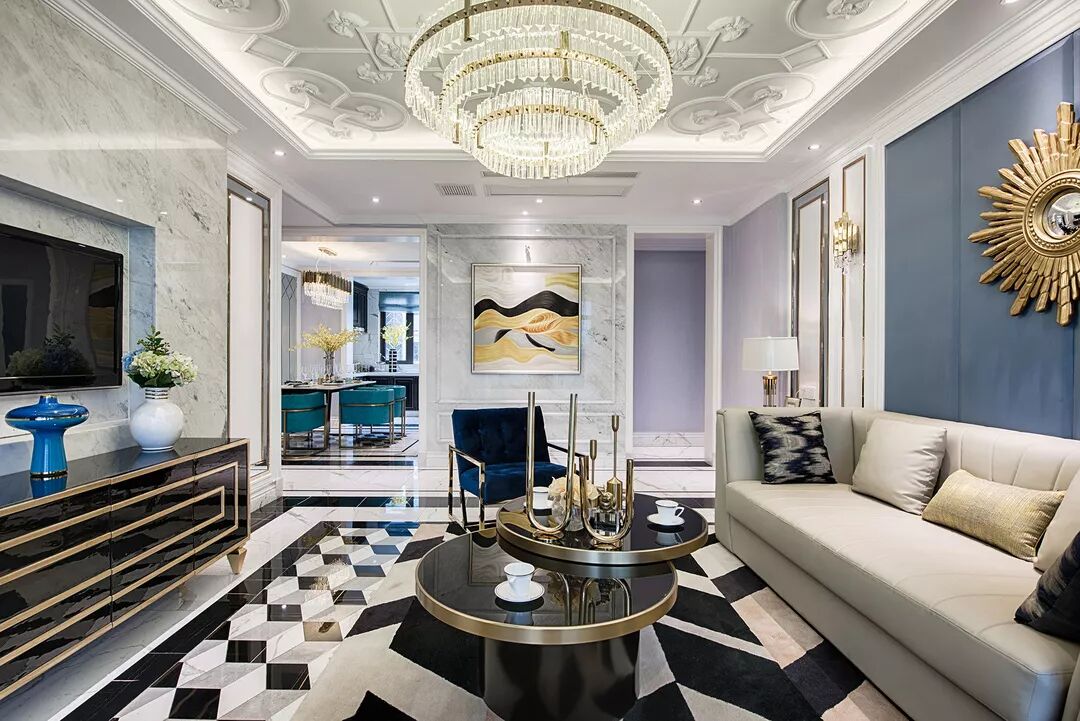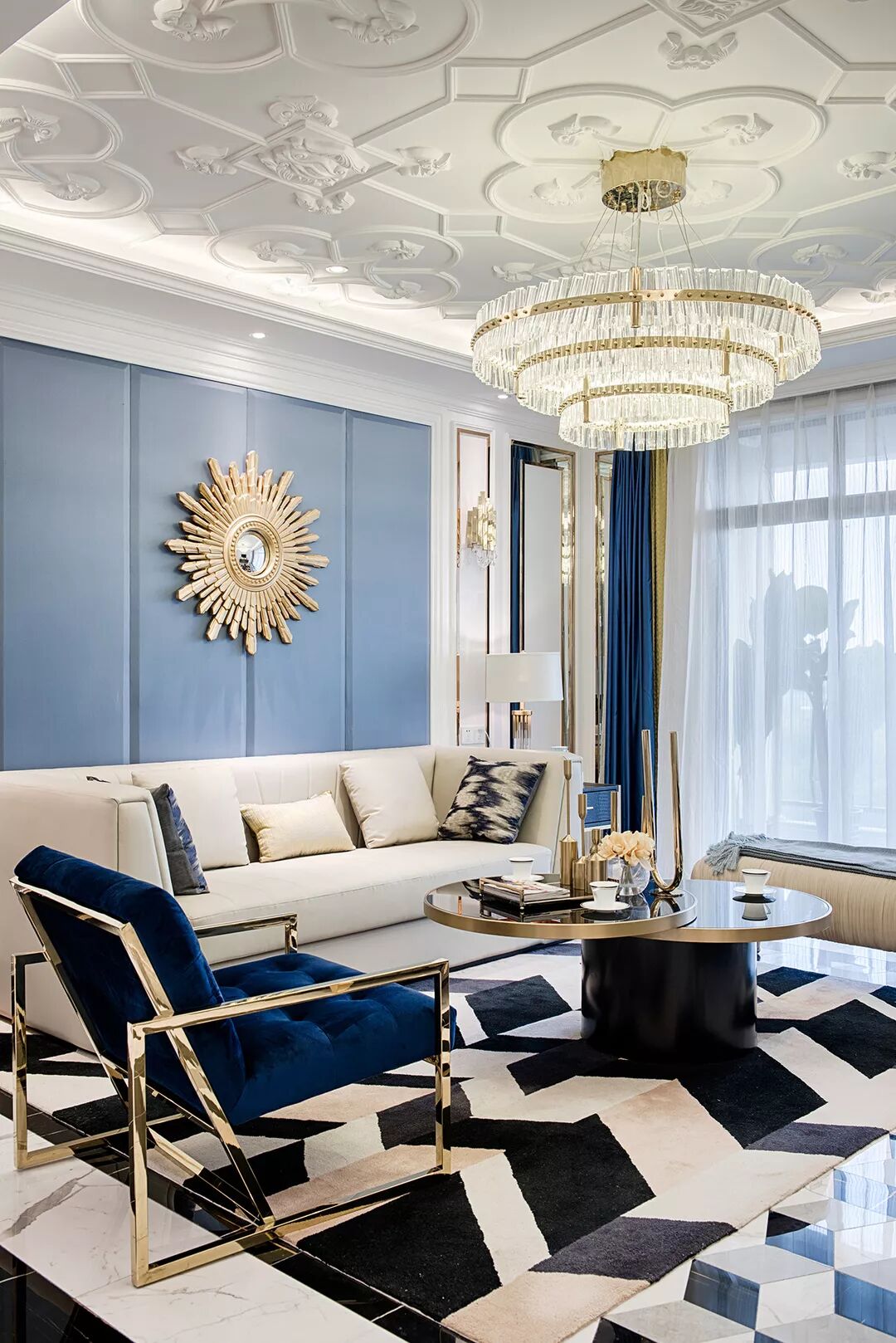 从被称为法国品味的洛可可 到取代它的新古典主义 法国以及整个欧洲 世界 都在不停的更换着时代的口味 许是吃了太多甜腻繁复的重口味 现代人更偏好于轻 轻度的优雅 轻度的奢华 更贴近现代的审美 也更贴近现代的生活方式 真正的法式优雅,属于高尚的格调和内敛的情怀 而这植根于法国人骨子里的罗曼蒂克 任何表象的花哨与浮华都无从表达。 轻度·奢雅 本案是一套精致的浪漫法式案例 在风格上设计师摒弃传统法式的繁复冗杂 采用淡雅的空间色调结合几何线条 打造出一个法式轻奢主义的空间 客厅中采用了16年潘通年度色 静谧蓝 配合轻奢金 明亮淡雅 方形纹样深浅色交织地板 搭配担当重色功能的 黑色茶水案几 孔雀蓝金属方边单椅 让空间色调在和谐统一的基础上 更具视觉层次感为空间平添几许温度与生气 曲线 传统法式风格中 随处可见的设计元素 在这个现代轻奢空间中 也得到延续使用 圆形吊灯 U型烛台 甚至曲线纹样的墙面装饰画 使整个设计变得刚中有柔恰到好处 轻度·蓝金 整个空间中都贯穿着蓝色 而最温柔的那一抹就在主卧室中 无论是睡前的思考还是阅读 偏粉的蓝色在空间中让人沉静下来 安静的享受每一天的睡前时光 ▼▼▼ 次卧则选用了玫瑰金色调 灰褐色随着玫瑰金 低调优雅 几何切割的钛金饰物 是空间中的亮色点缀 也带来空间变化的连续性 舒适感与美观并存 ▼▼▼ 餐厅中同样沿用了整体的蓝金色调 半开放式厨房 配以几何形装饰 白色大理石砖 敞亮干净 半开放式也符合当下的社交需求 不再是传统的闭门造车 让家人之间有了更多的交流 ▼▼▼