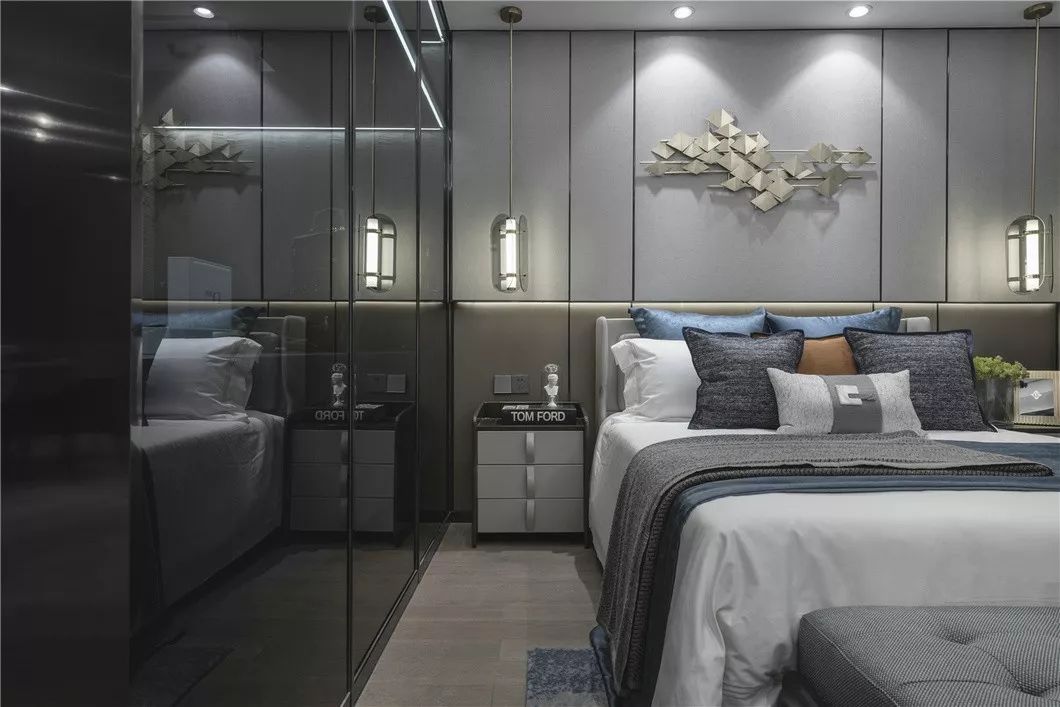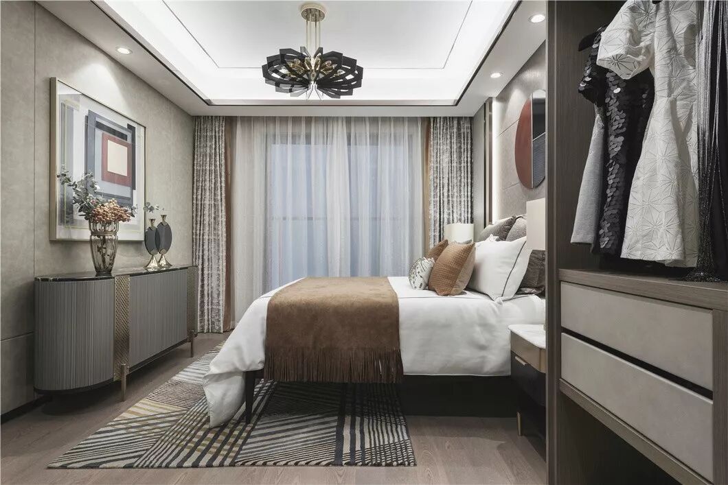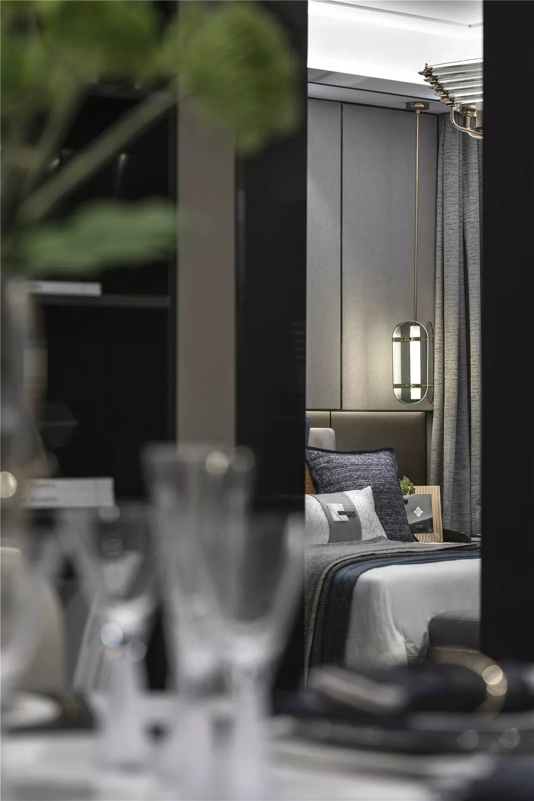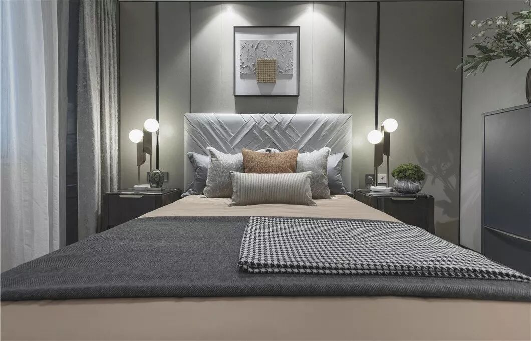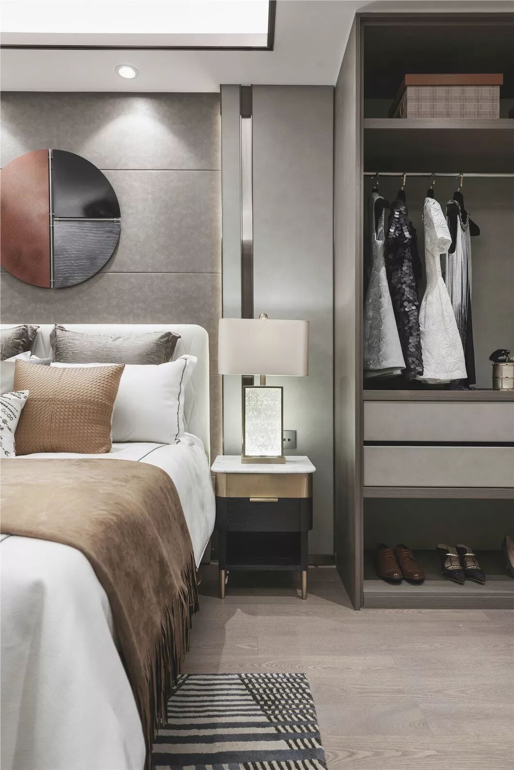 主卧色彩以高级灰为主轴,局部辅以棕色铺陈温暖调性,萦绕一室温雅悠然之气氛。点、线、面的完美结合,丰富了简约空间里的艺术形态,包容着空间的多重想象。