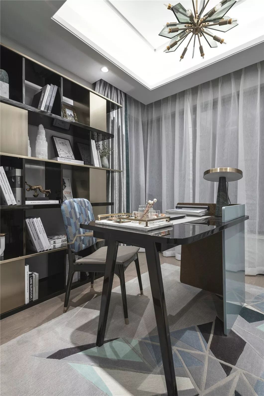 移步书房,设计师创造性地运用细腻的色彩、极致的细节处理,打造一方艺术、人文、情感相糅合的空间。不规则的几何图案地毯神秘而富有张力,让空间更显生动。
