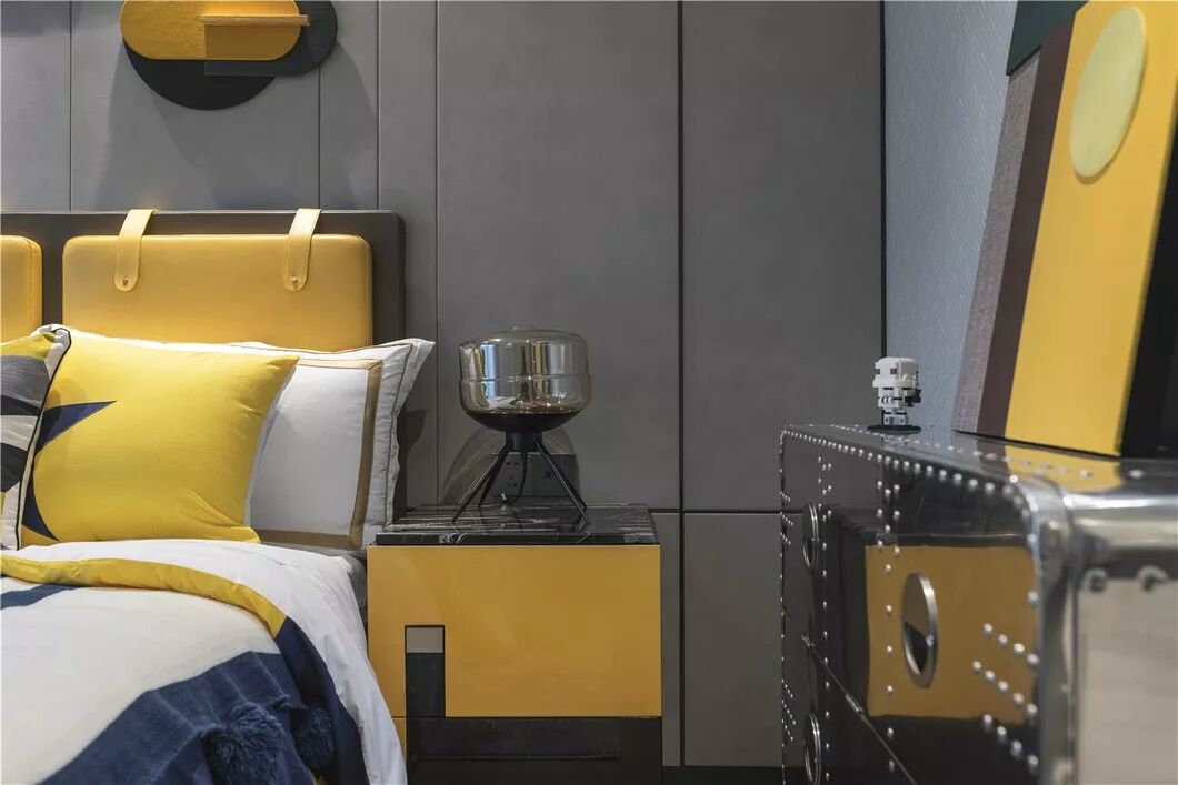 儿童房跳脱出风格的藩篱,高级灰搭配几许明亮黄,在低调与明艳的碰撞中,彰显出孩童的天真无邪。冷暖色调的交融,透着律动的节奏感。