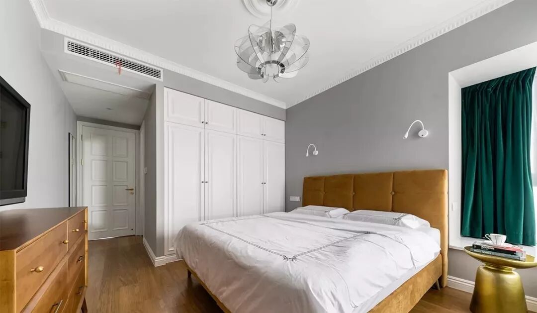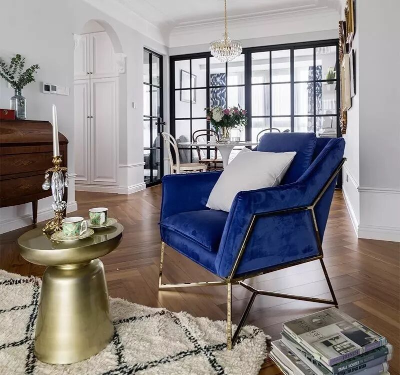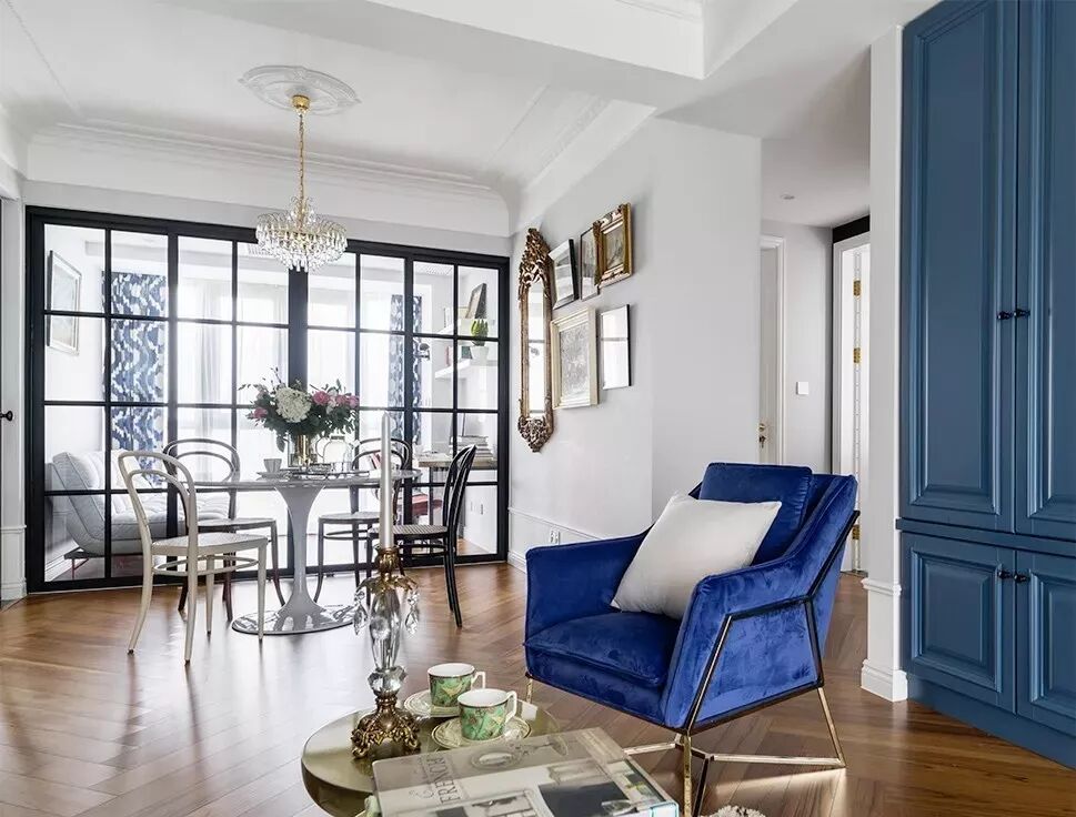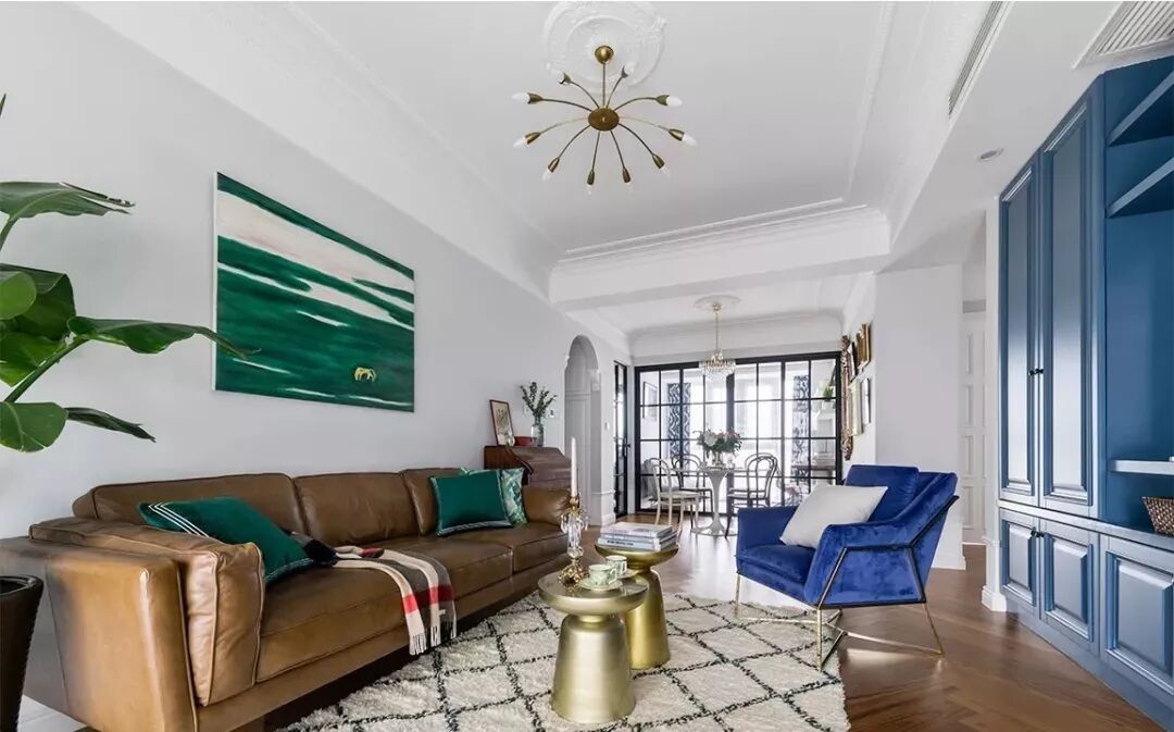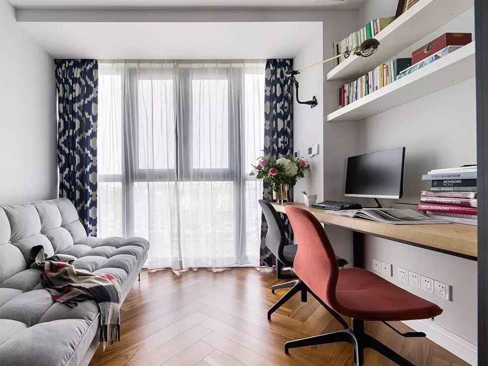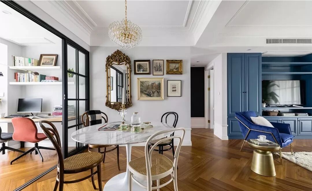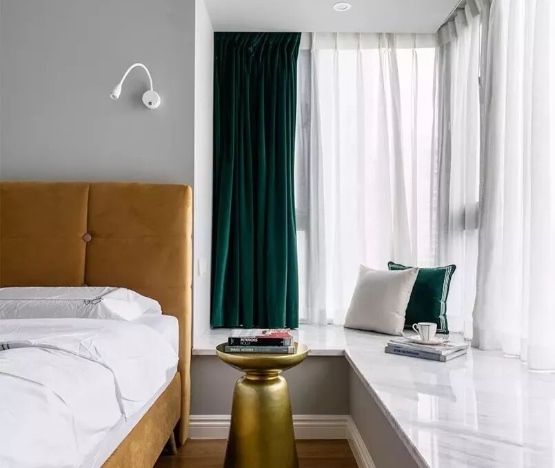 玄关处也预留了丰富的储物空间,墙上的挂钩可以方便地收纳常用的包包,出门要穿的大衣、围巾、帽子等。 房子的整体风格是混搭的,既有北欧的简约,法式的轻奢,也有很多现代元素的加入。而这种软装混搭,也成了房子设计时最大的亮点。 最出彩的设计就是软装部分。选用低饱和度的颜色打底,局部选用小面积的高饱和度颜色提亮。整体看去既跳跃又毫不违和。 进入第一眼就会被马尔代夫蓝的电视柜吸引。棕色皮质沙发是偏硬质感,长时间窝在里面看书、看电视都不会觉得累。 巧妙地将电视柜和储物空间结合在一起,在颜色上选择了深蓝色,把它作为一个具有一定装饰性的主题来处理。 简单小巧的金色圆茶几摆放常在客厅看的书或者喝茶的茶具绰绰有余。为客厅腾出了相对完整宽敞的空间供孩子自由奔跑。 进门左侧就是餐厅,墙上装饰的复古壁画,法式壁镜为餐厅增添浪漫风情,而且可以通过镜面效果扩大餐厅视觉空间。 有趣的是,四把餐椅,每把都选了不同的款式和颜色。针对这一点,就像我们日常穿衣,大多数人都不会只穿套装,家具也是这个道理。 隔断门口原本是个阳台,很小很窄,非常鸡肋。家里正好需要一个书房,把原阳台向餐厅区域推进了一部分,变成了一个宽敞舒适的书房。 卧室搭配了一直很受欢迎的黄色和暖色。一进门就是一个落地穿衣镜和巨大的衣帽间,满足丰富的收纳需求,早起换衣打扮在卧室就可完成。 与客厅相同的圆心金色茶几作为床头柜。简洁的灰色墙壁让人一进门就睡衣袭来。增加了收纳柜和电视机,睡前看看电视来放松。 原户型的窗户在怪角位置,坐在窗台上看书或者不想出门的时光,在坐在窗边发呆,看风景。如此,甚是惬意。