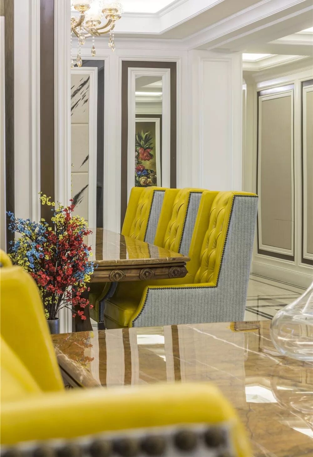 餐厅与客厅用过道隔开,不会显得杂乱,亮黄色的座椅,与客厅产生了遥遥对比,彼此都活跃了起来。后面的开窗让餐厅更为明亮之余,还能欣赏窗外风景,功能与美感并重。