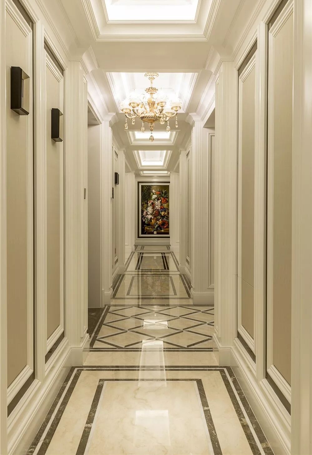 暖色调的灯光,象牙白的顶面、墙壁与地板,搭配以灰色,米色的家具,整个格调典雅大气,又不会过度奢华,十分惬意宜人。