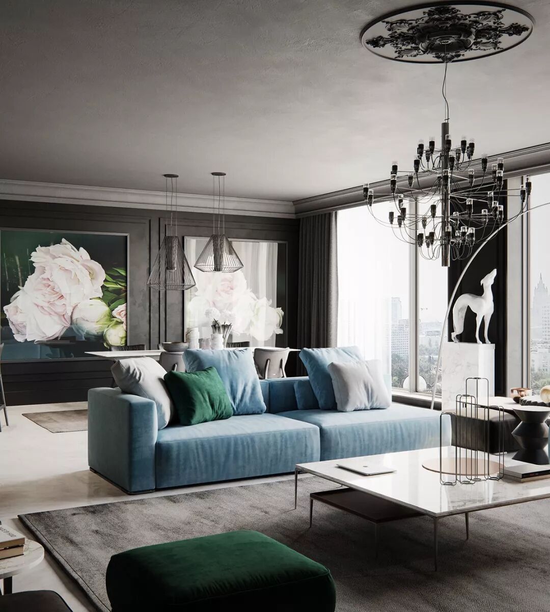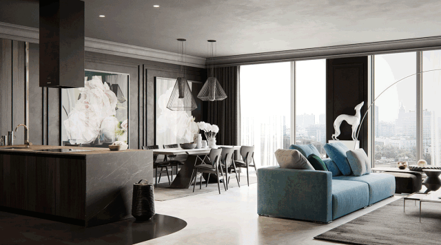 ▎混凝土地面搭配深灰地毯,将客厅的古典气质以现代主义的审美视角展现的淋漓尽致。
