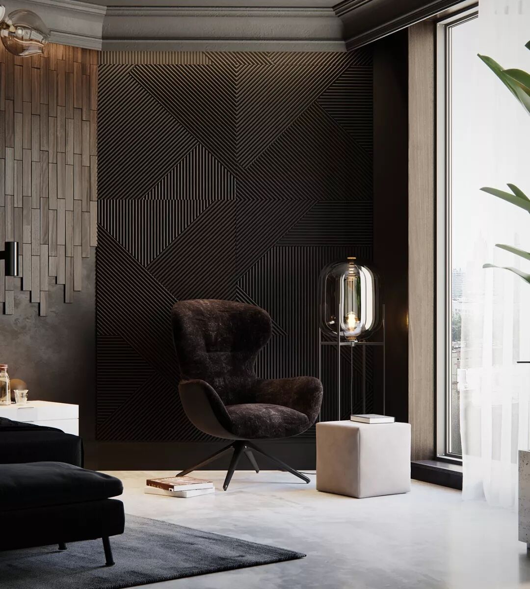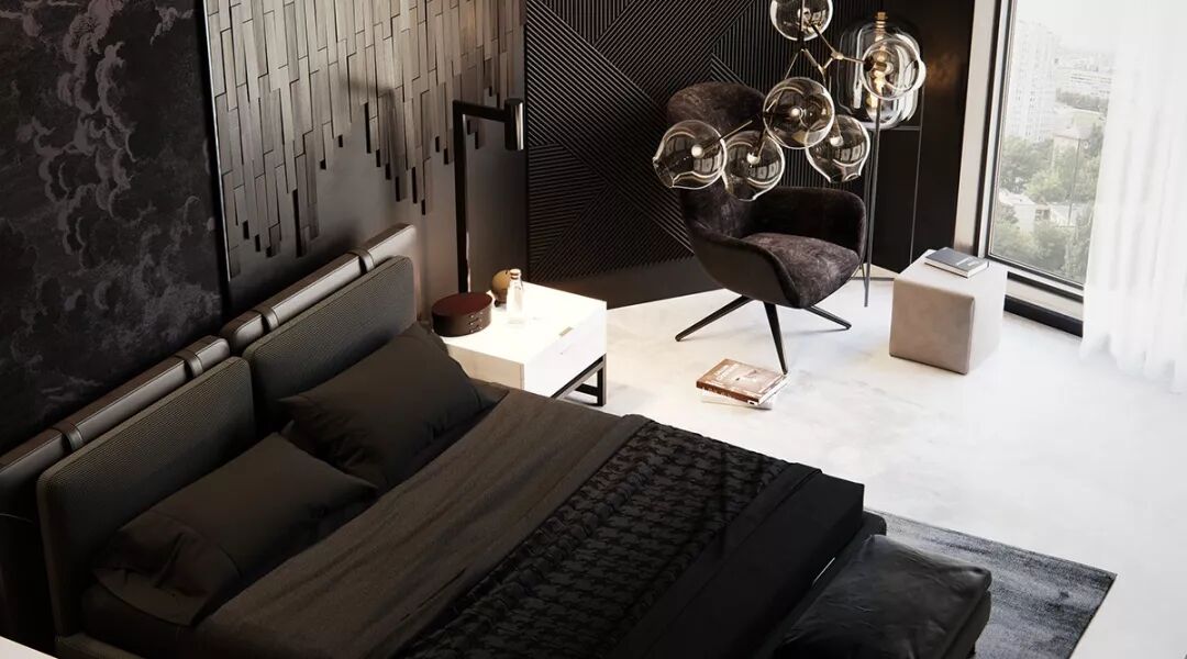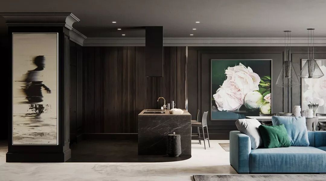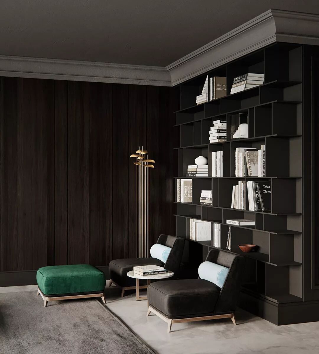 ▎这套案例,以轻古典风为主轴,结合各种材质的运用打造更为活泼的暗色空间,其中墙面装饰很好的突显了室内空间的环境层次及丰富立体感。