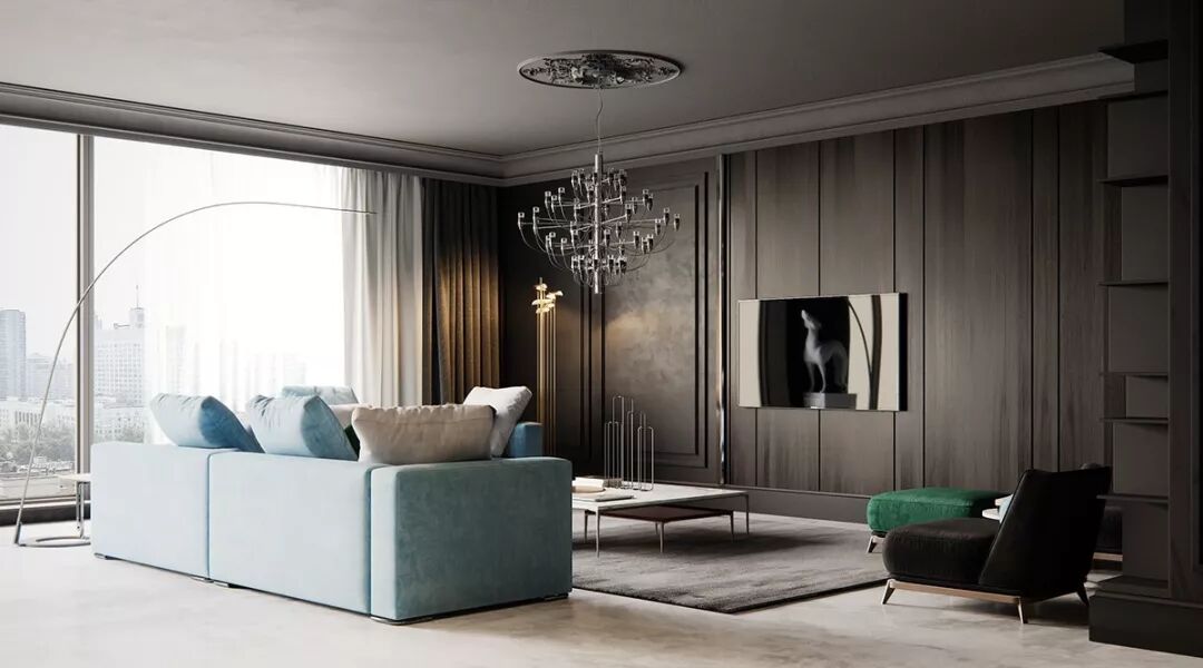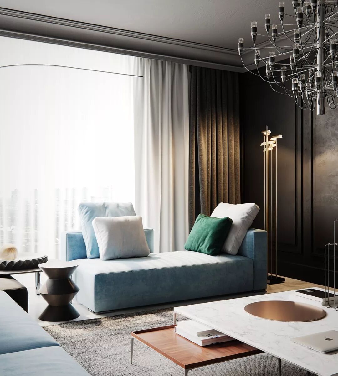▎客厅选择以低饱和度的深棕护墙板作衬托,让沙发的蓝色在大地色系中注入一抹冷调。
