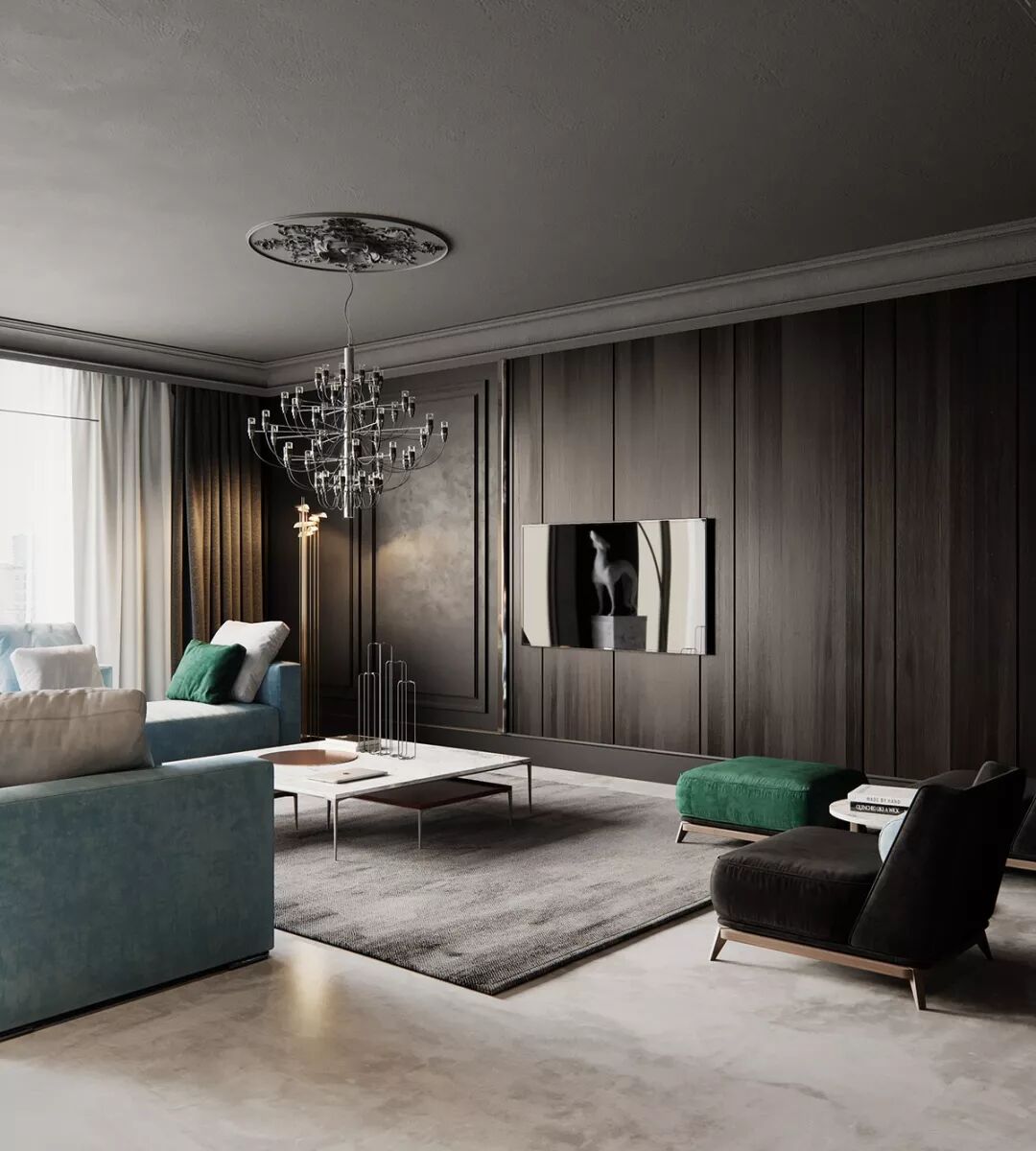 ▎全金属的枝型吊灯造型古典,与水波纹大理石茶几形成不同材质和风格的对比,电视机采用壁挂式设计仅用护墙板做装饰。