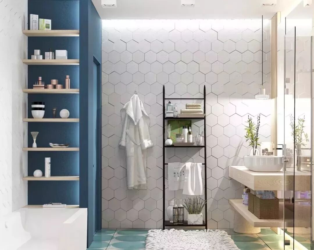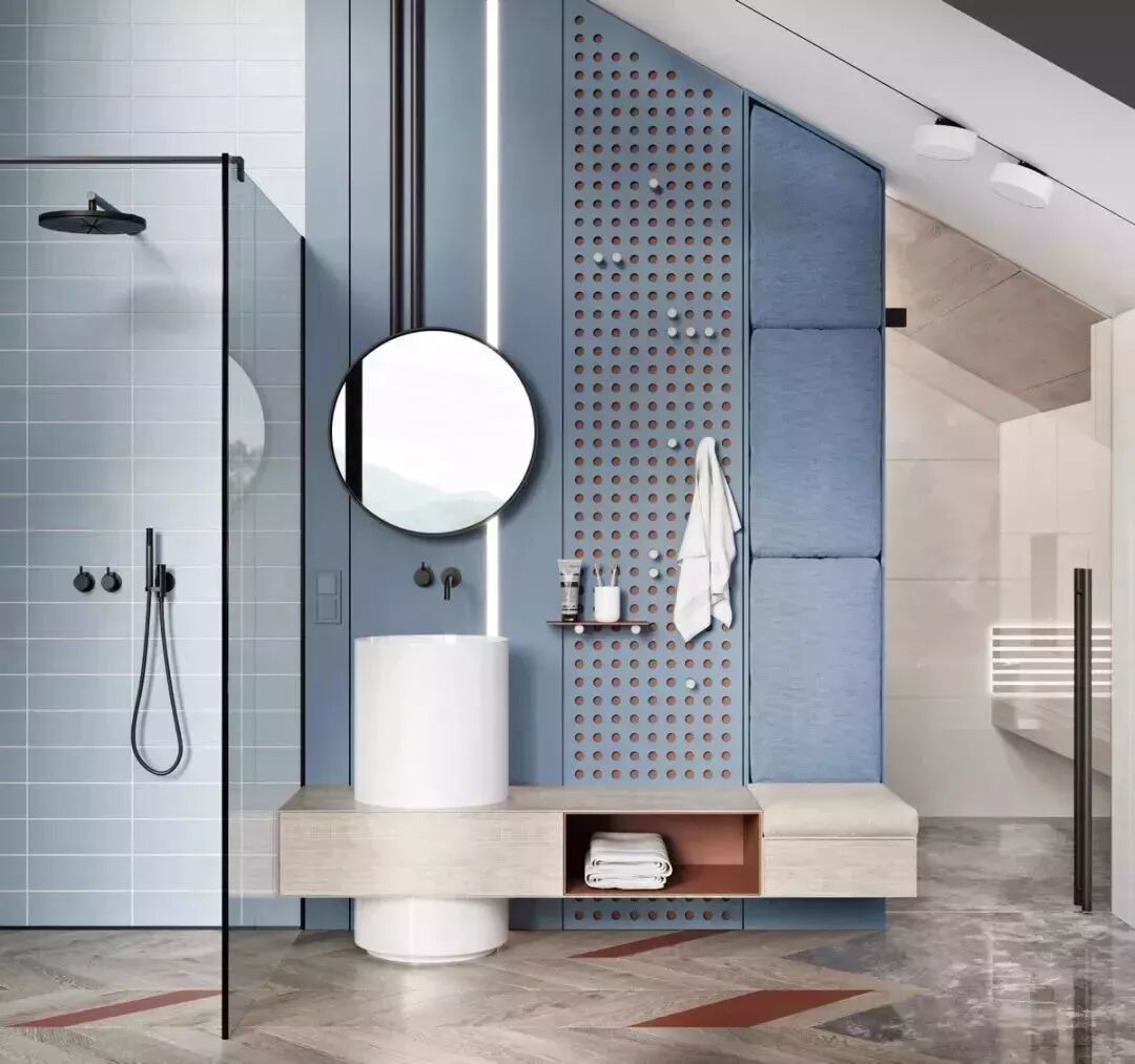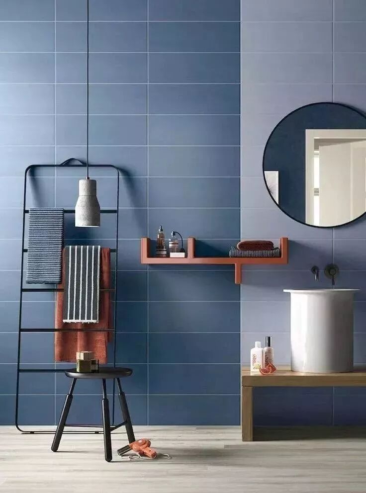 蓝色,是一种冷静而深邃的颜色,它容易让人联想到大海、天空、宇宙等一切神秘而浩瀚的东西。将不同的蓝色运用到卫生间中,可以产生不同的视觉效果。