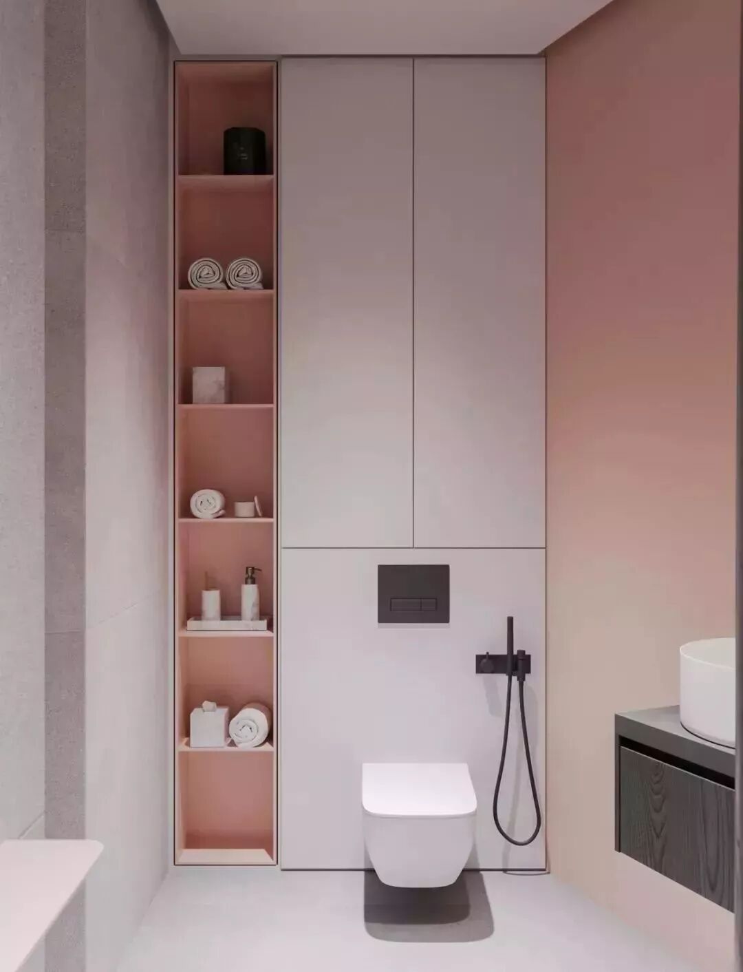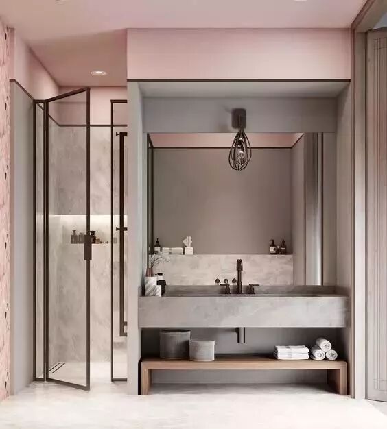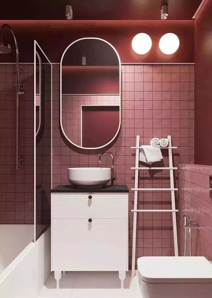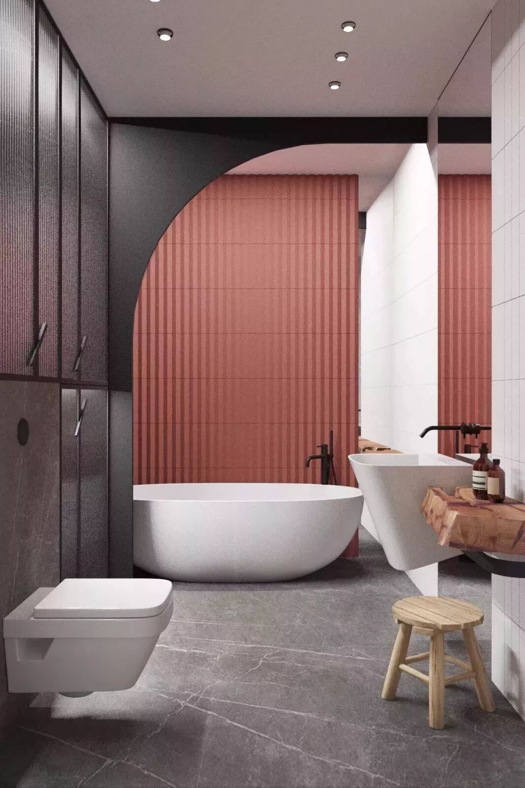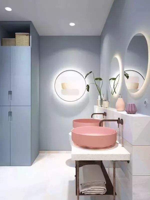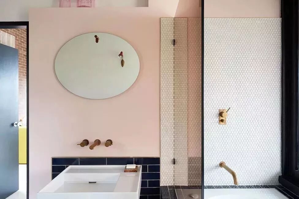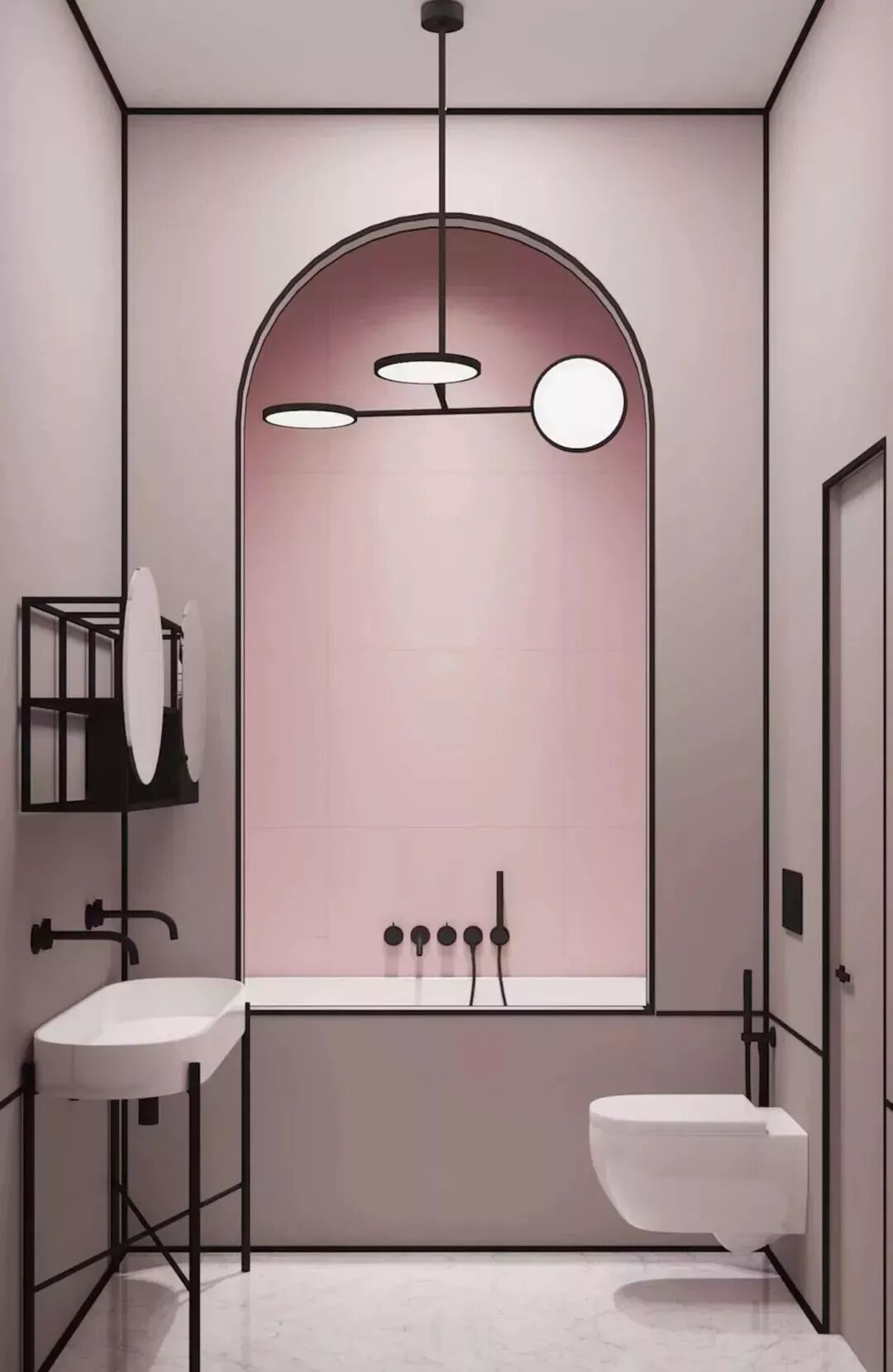 柔和浪漫的粉色卫生间,可以最大化地满足一颗少女心。它甜而不腻、暖而不燥,不仅能够非常百搭地融入任何风格的空间,而且可以打破纯色带来的单调感,无需过多外在修饰,便会在内敛中渗透着独特的品位。 如果不喜欢大面积的粉色调,你也可以进行局部装饰,再利用简洁利落的黑色线条及隐藏式灯光稍加点缀,就能让卫生间成为家中的一大亮点,更增添了时尚优雅的气质。