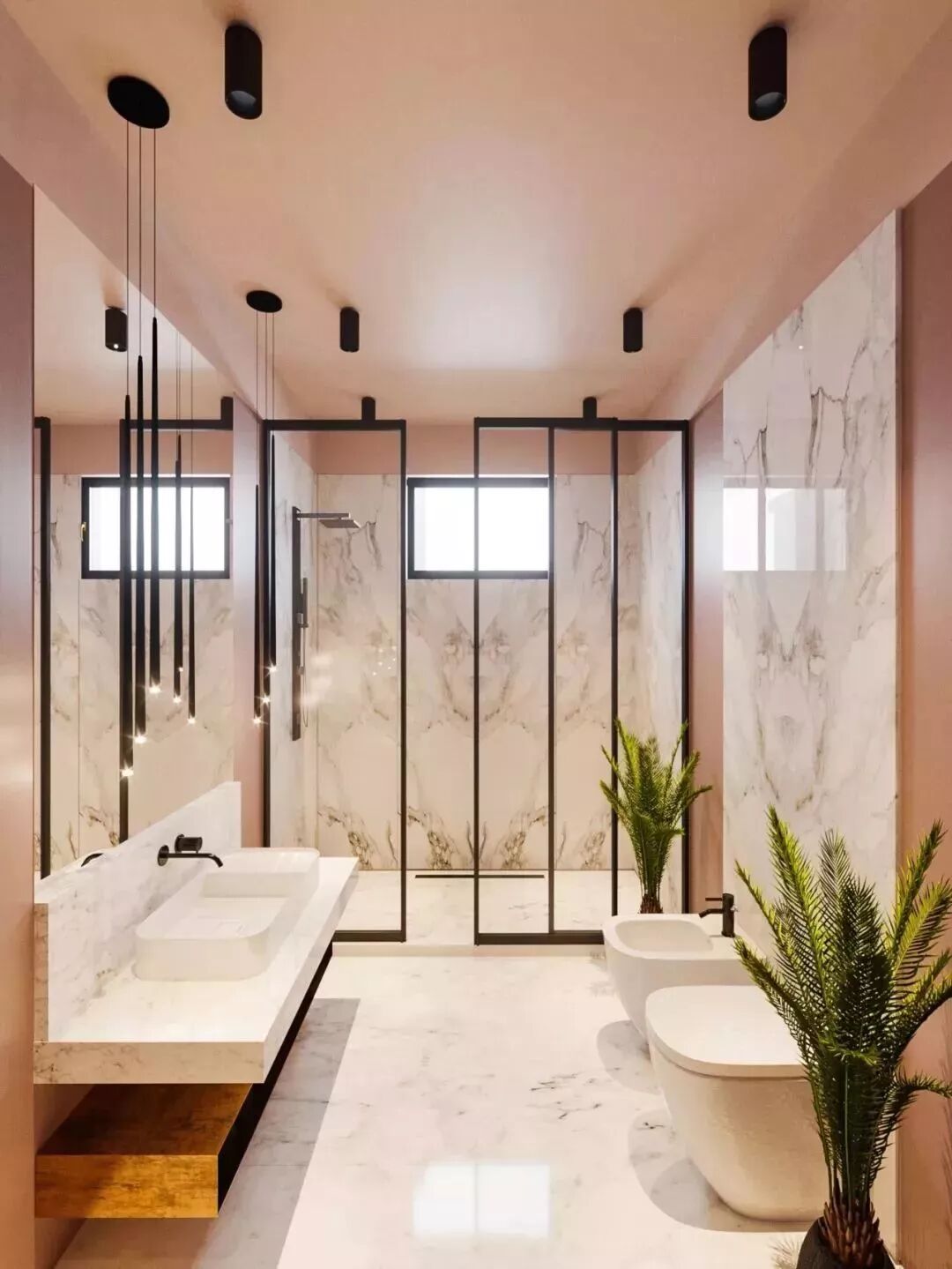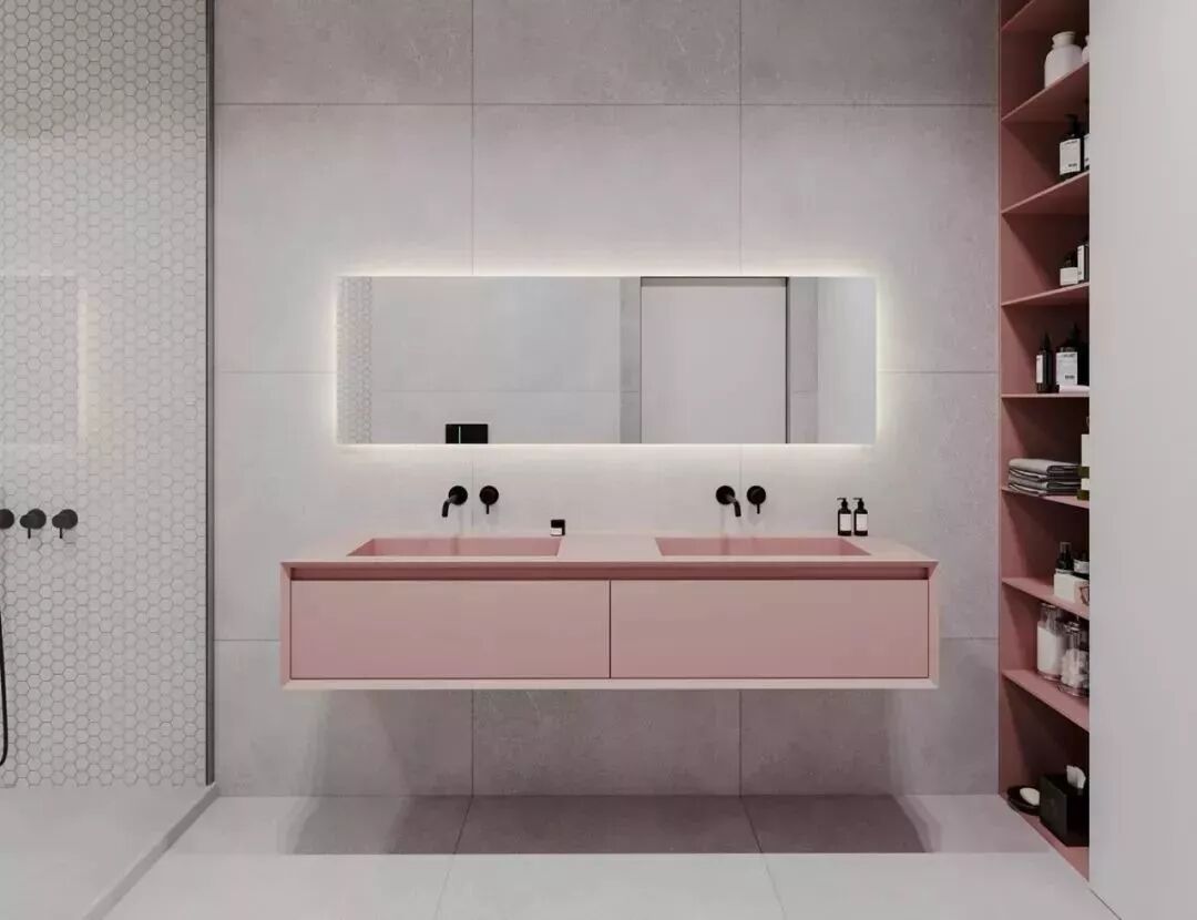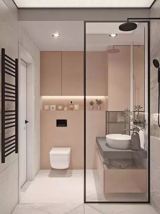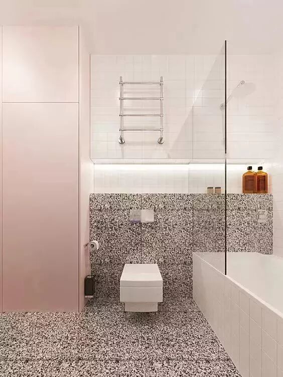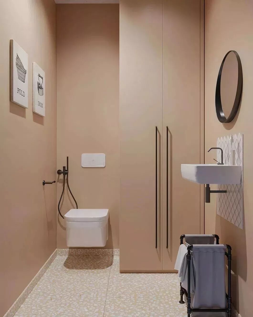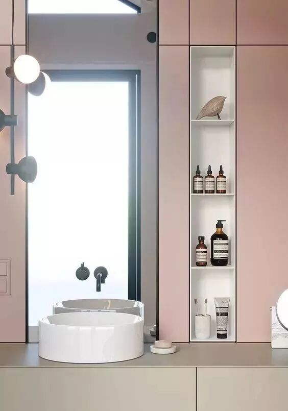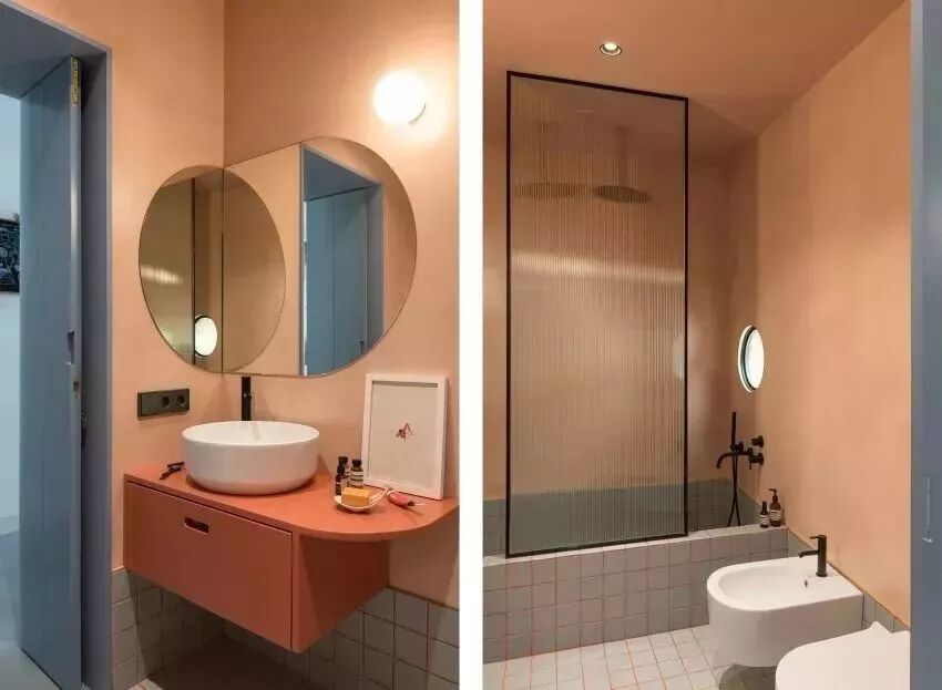 柔和浪漫的粉色卫生间,可以最大化地满足一颗少女心。它甜而不腻、暖而不燥,不仅能够非常百搭地融入任何风格的空间,而且可以打破纯色带来的单调感,无需过多外在修饰,便会在内敛中渗透着独特的品位。 如果不喜欢大面积的粉色调,你也可以进行局部装饰,再利用简洁利落的黑色线条及隐藏式灯光稍加点缀,就能让卫生间成为家中的一大亮点,更增添了时尚优雅的气质。
