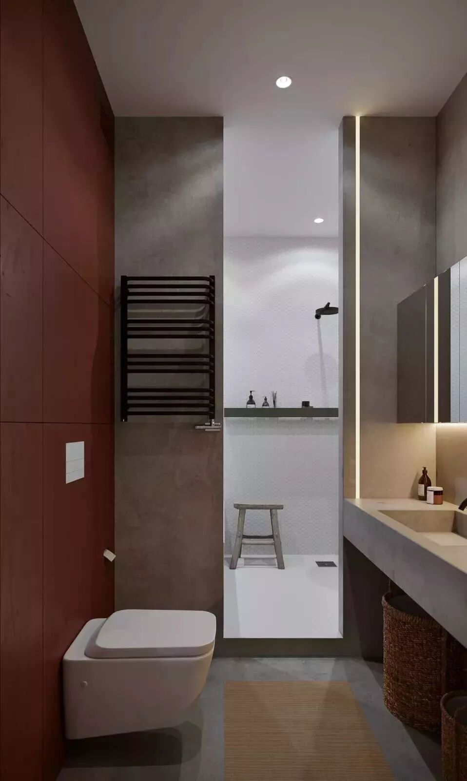 关于卫生间的色彩搭配,我们最常见的莫过于极简白、高级灰或是白与黑的简约组合了。因为卫生间是一个用来洗漱、卫浴的地方,选择单色调的墙面最能凸显空间的洁净之感。
