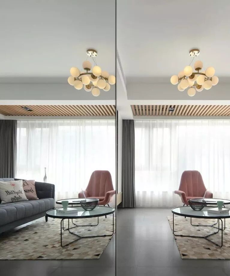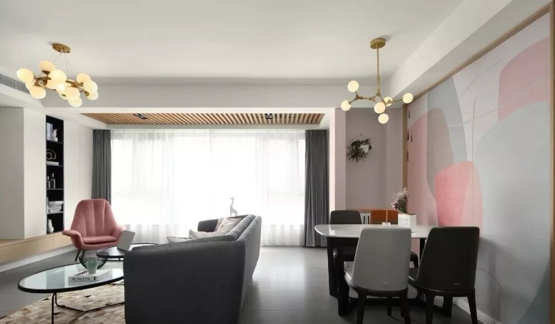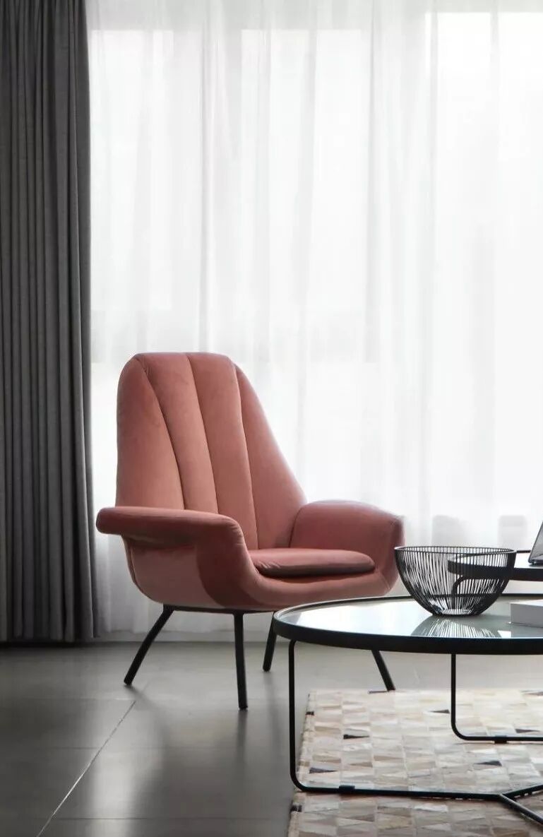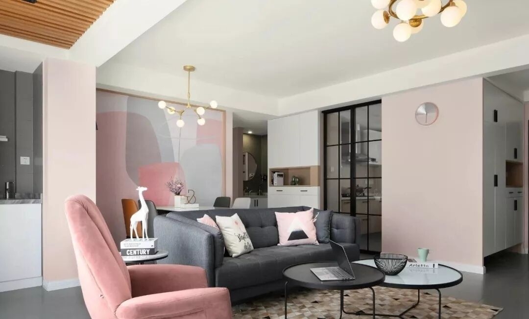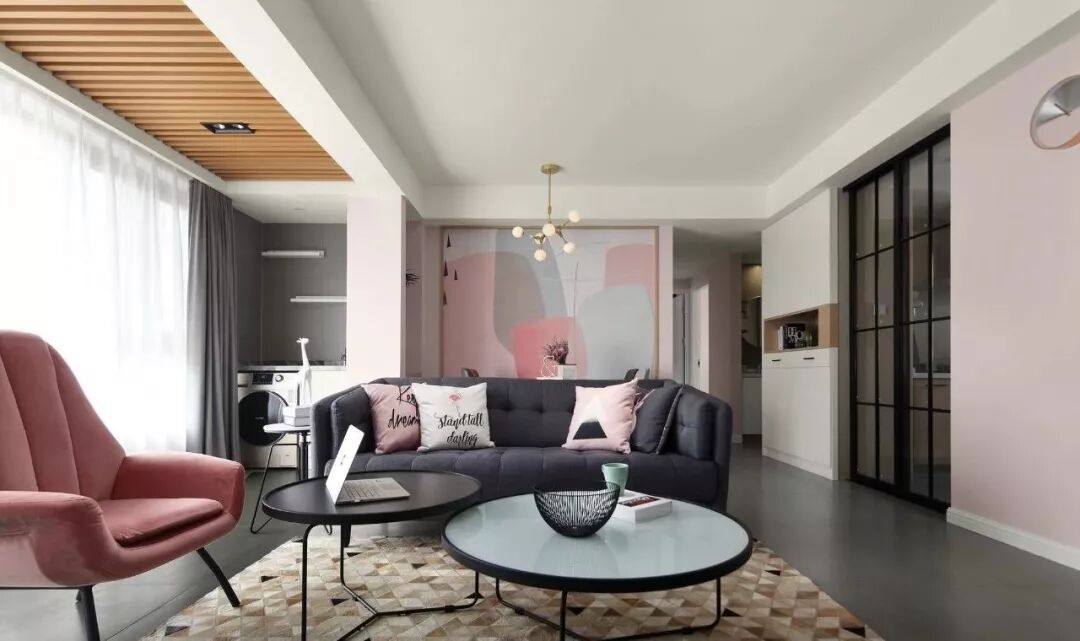 这是一个柔和的色彩空间,粉色将其饱和度降低,又与灰色相平衡,是一个理性的空间,设计师运用了许多黑、灰元素让空间更显高级感。