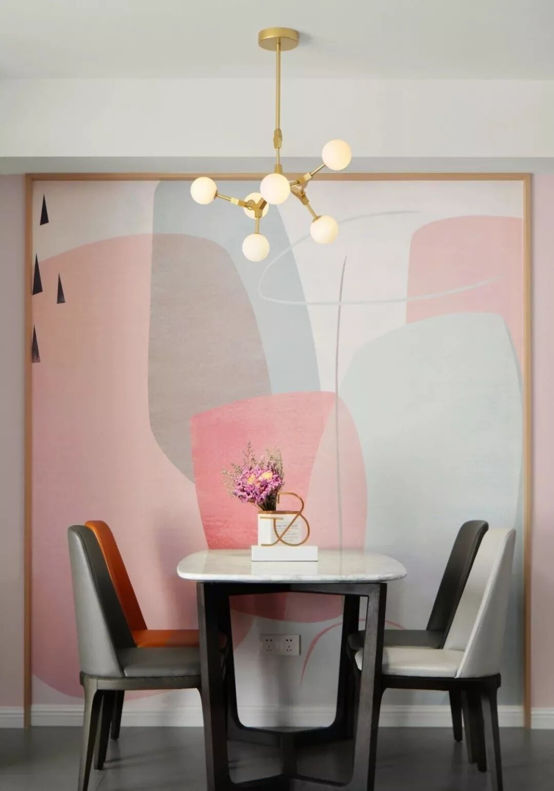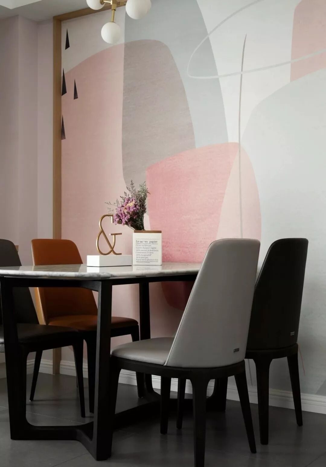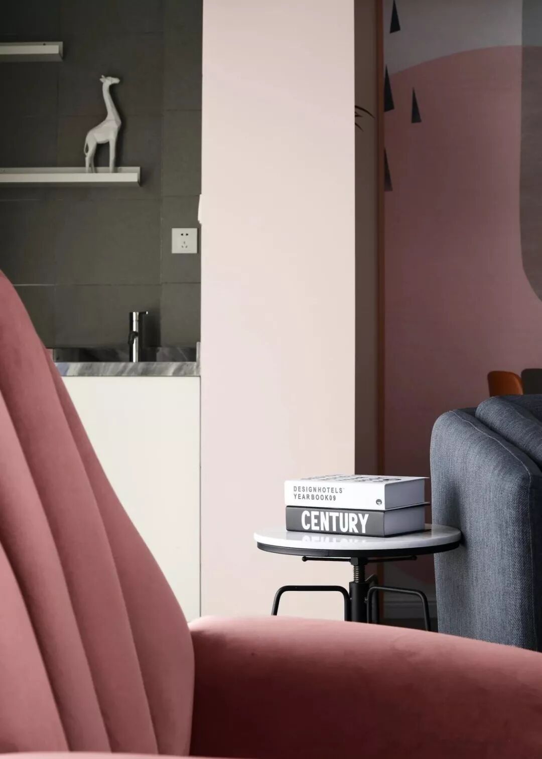 这是一个柔和的色彩空间,粉色将其饱和度降低,又与灰色相平衡,是一个理性的空间,设计师运用了许多黑、灰元素让空间更显高级感。
